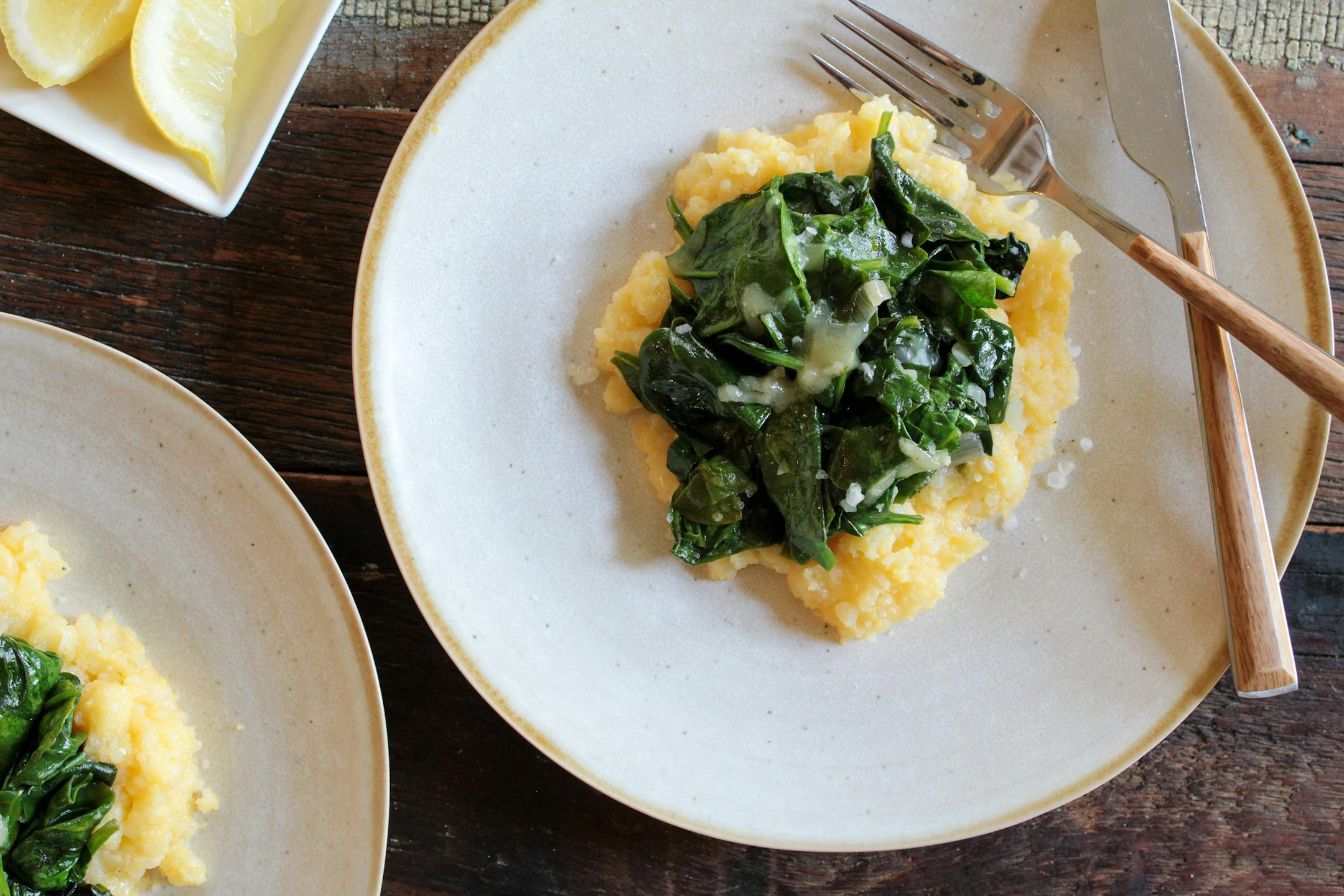 Fresh spring spinach makes a fine match; its mild flavor and nuanced mineral notes are a perfect balance to the lush golden cornmeal. Be gentle when sautéing spinach and use a light hand; it collapses quickly in the pan. Despite its fragile nature, spinach packs a powerful nutritional punch; it's loaded with vitamins A and K, folate and iron, magnesium and potassium, and plenty of vitamin C.