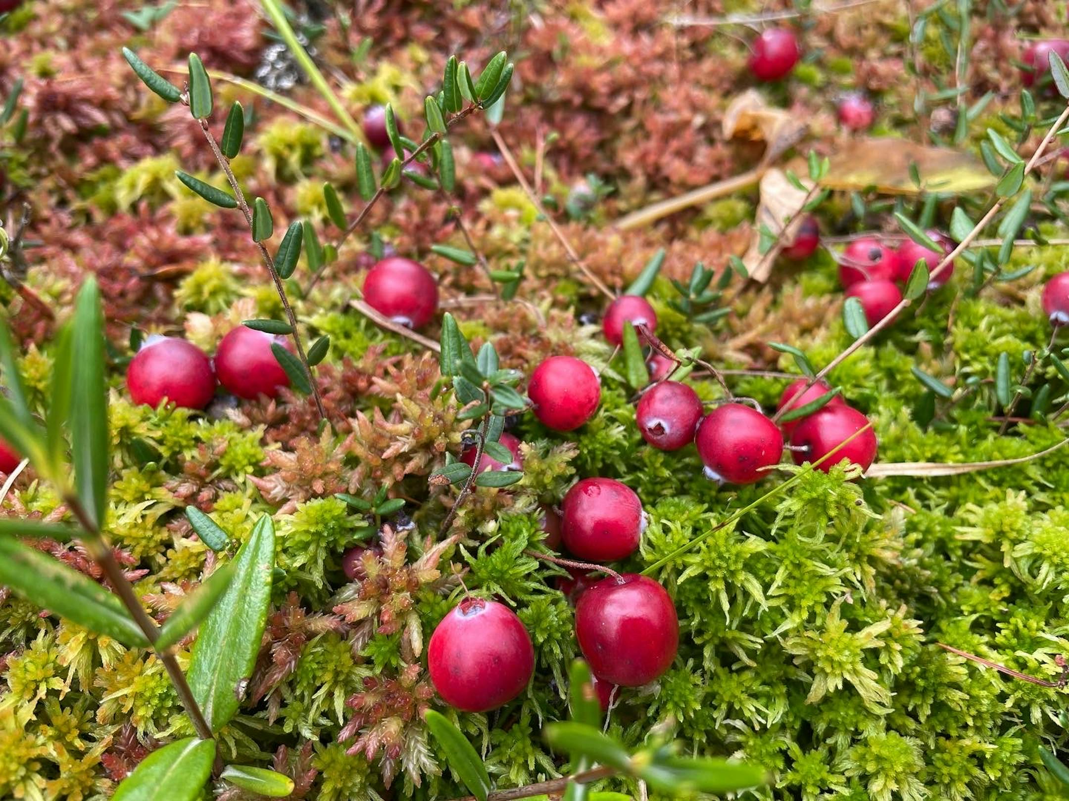 Considered a superfruit for its vitamins, antioxidants and other health benefits, cranberries thrive in sandy soil near acidic bogs. The plants often twine into sphagnum moss and can be challenging to find without rain boots or waders.