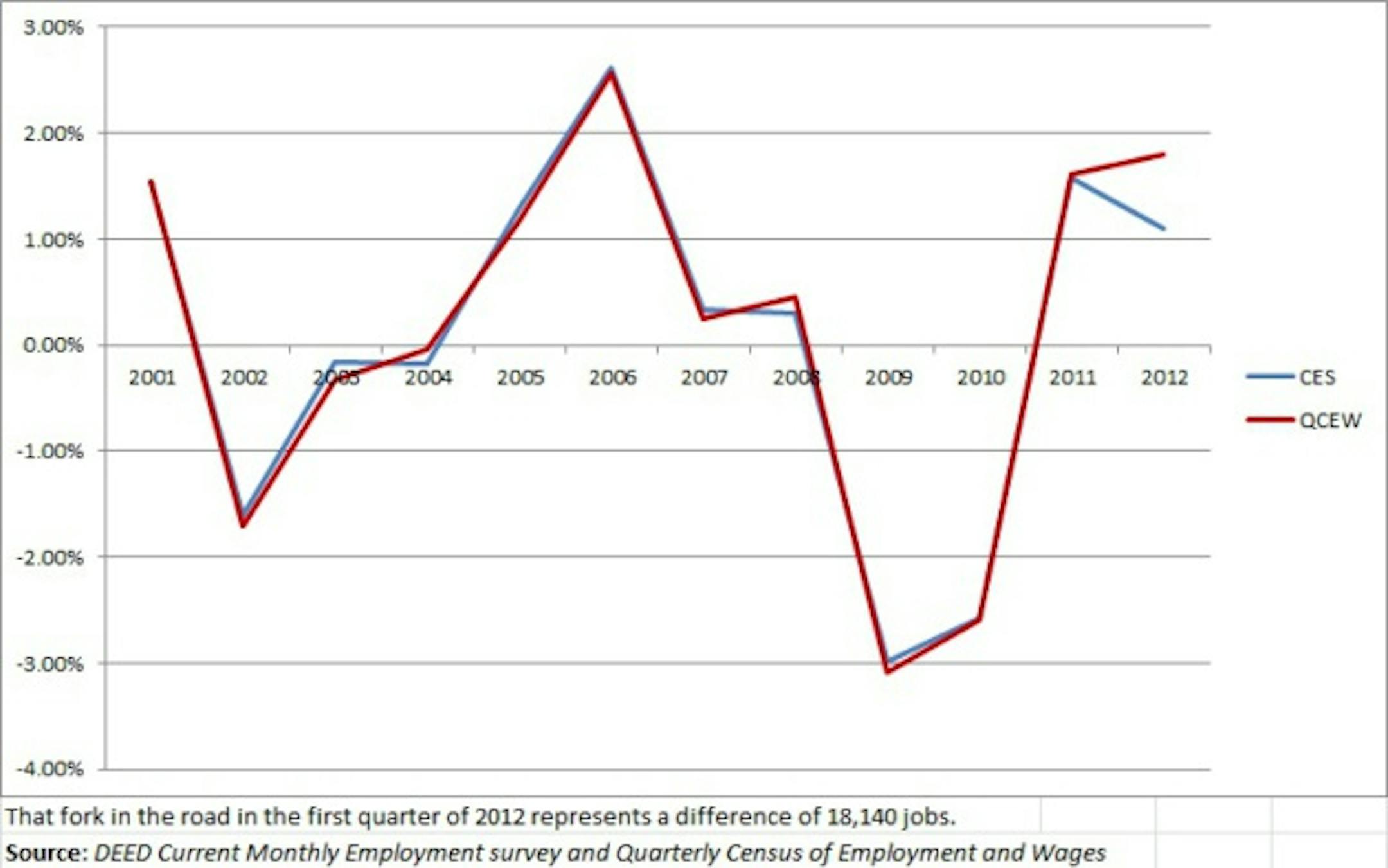 The QCEW is, as its name makes clear, a census. State officials track down every employee for whom unemployment insurance is collected (pretty much every worker in the state), and come up with a total number of jobs in Minnesota. It's as close to accurate as a jobs number can be.