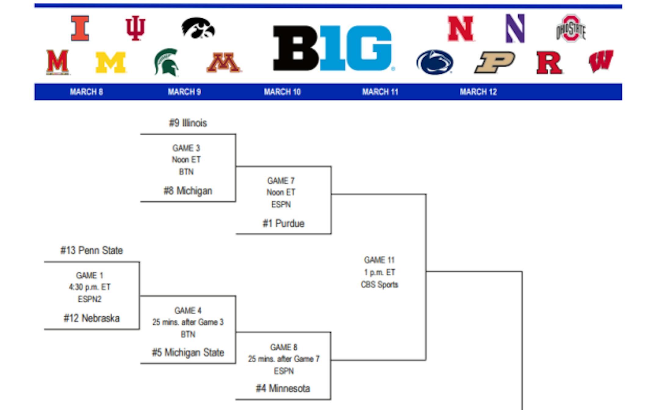 The Gophers finished fourth in the Big Ten regular-season standings and earned a double bye in the conference tournament. The winner of Nebraska and Penn State advances to play Michigan State, and the winner of that game will face the Gophers on Friday.