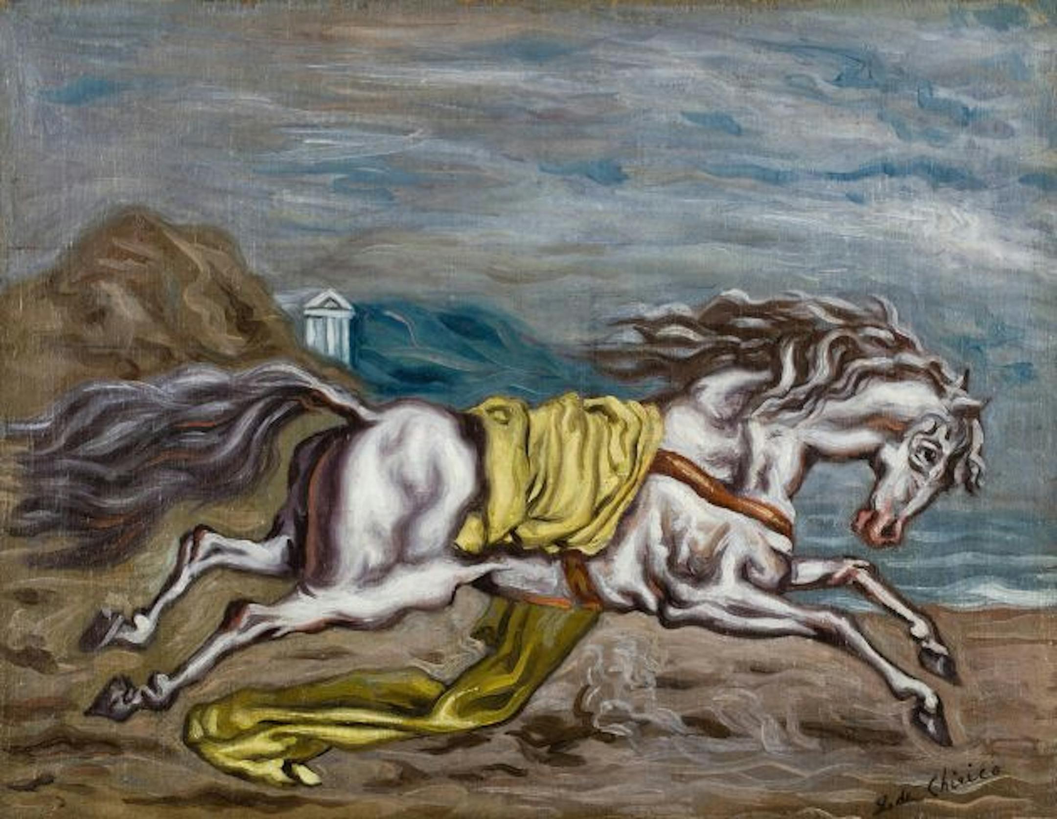 The four paintings come from a broad range of backgrounds. The grand painting "Cavallo Fuggente" (1938), by Greek-born Italian painter de Chirico, portrays a racing white horse with a yellow sheet falling from its back, racing forward against a backdrop of rippling blue water, murky grayish skies and a three-columned building.