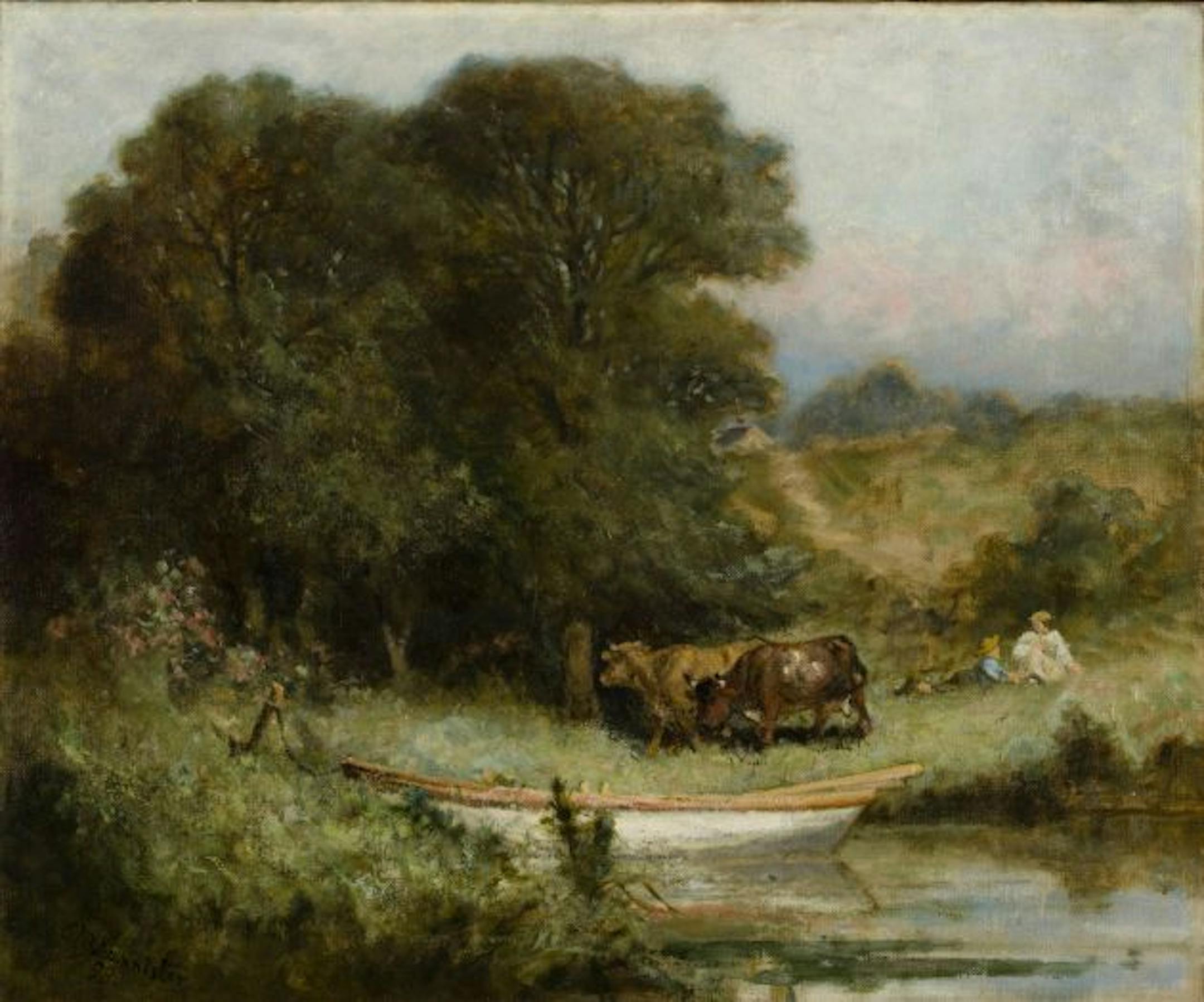 "Rhode Island Afternoon" (1898), by African-Canadian-American artist Bannister, is a pastoral scene depicting people sitting in a field while two cows wander by a creek. Bannister was determined to become an artist despite intense racial discrimination during his lifetime. After reading an article in the New York Herald in 1867 that bashed the ability of black artists to make meaningful work, he committed even harder to his career, according to the Smithsonian American Art Museum. In 1867 he became the first African-American artist to win first prize at the Philadelphia Centennial Exposition. He made a life for himself in Providence, R.I., and died in 1901 while attending a prayer meeting at his church.