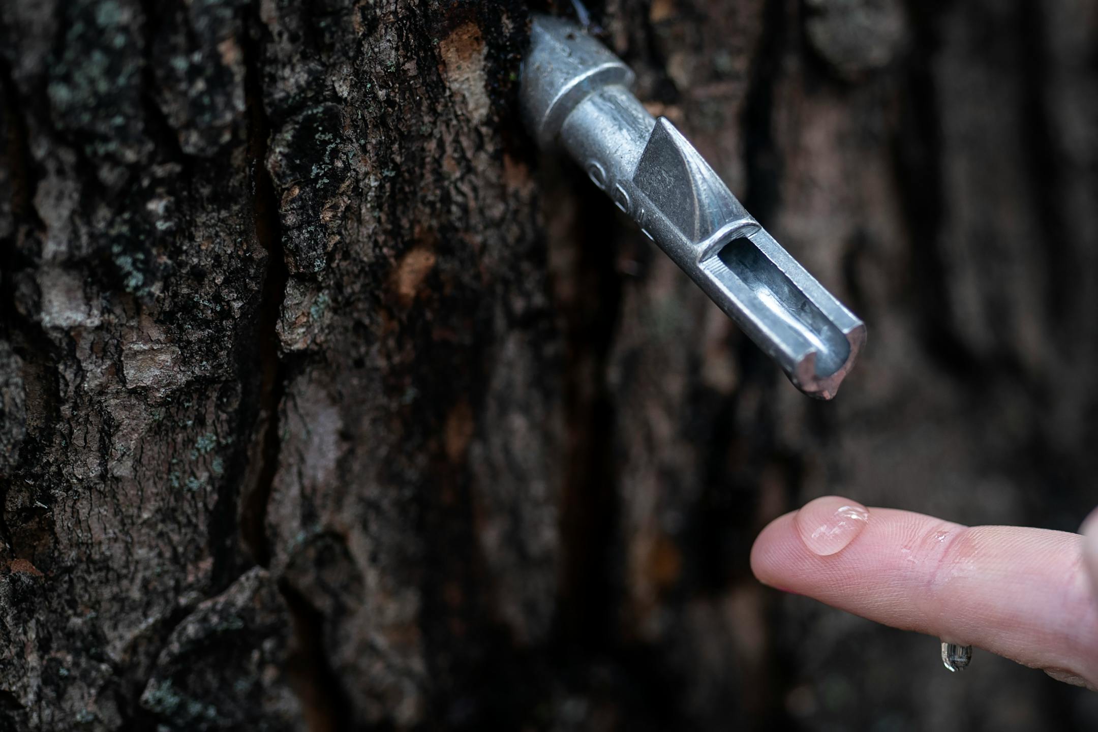 Their son Peter came from Rochester the weekend of Feb. 19 to help with the drilling and tapping of the sugar maples. Sap flow is triggered by thawing days reaching into the 40s. Last year they recorded their first sap flow of the year Feb. 26. This year it was the 28th, when Don said "the trees are just starting to wake up."