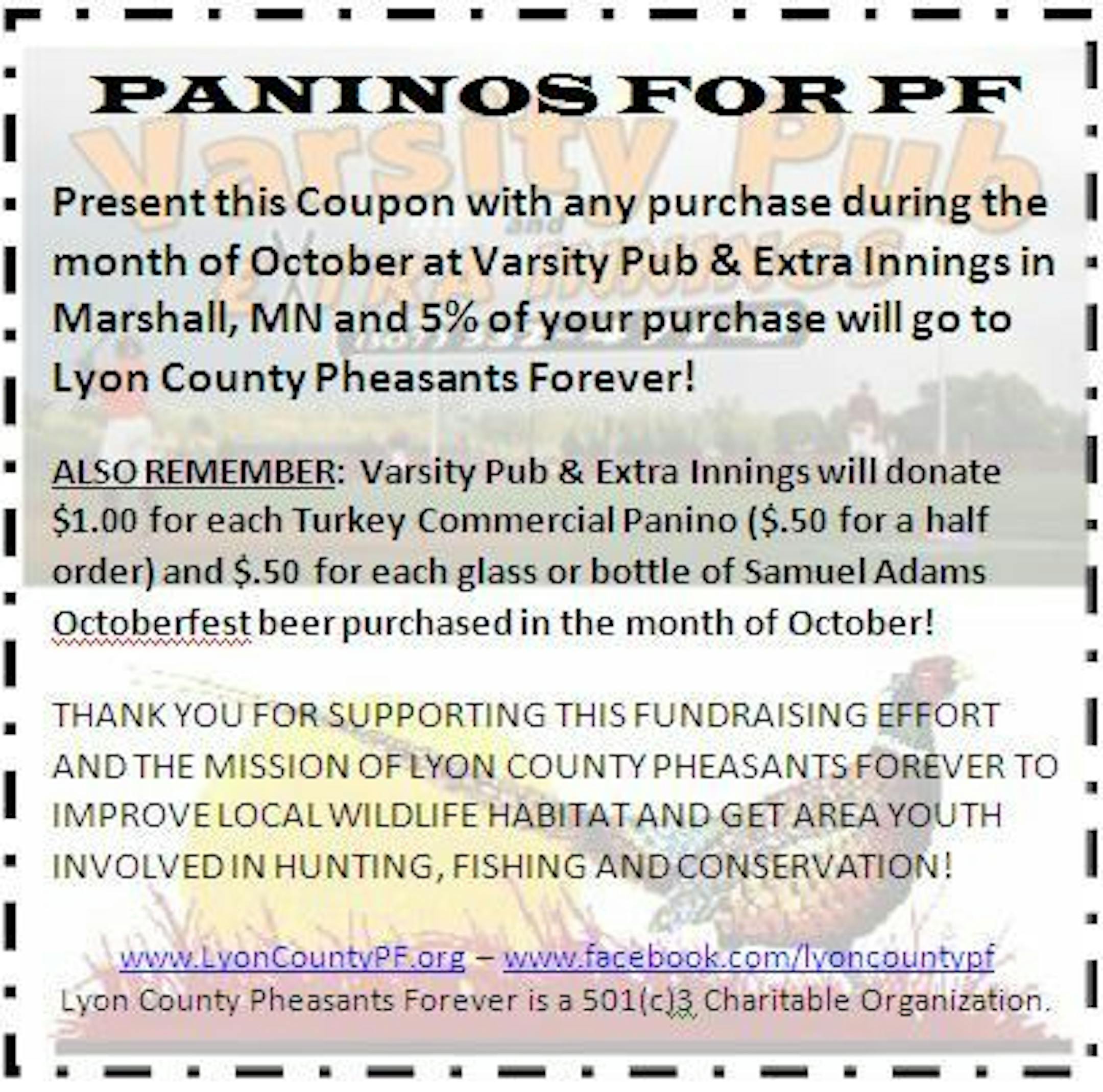 - Who's hunting the Marshall area in southwest Minnesota? When you're ready for lunch or your post-hunt meal, consider visiting the Varsity Pub and Extra Innings. The Lyon County Pheasants Forever chapter has teamed up with the establishment to raise funds for the chapter's wildlife habitat work and youth conservation education programs. Print out this coupon and bring it with you.