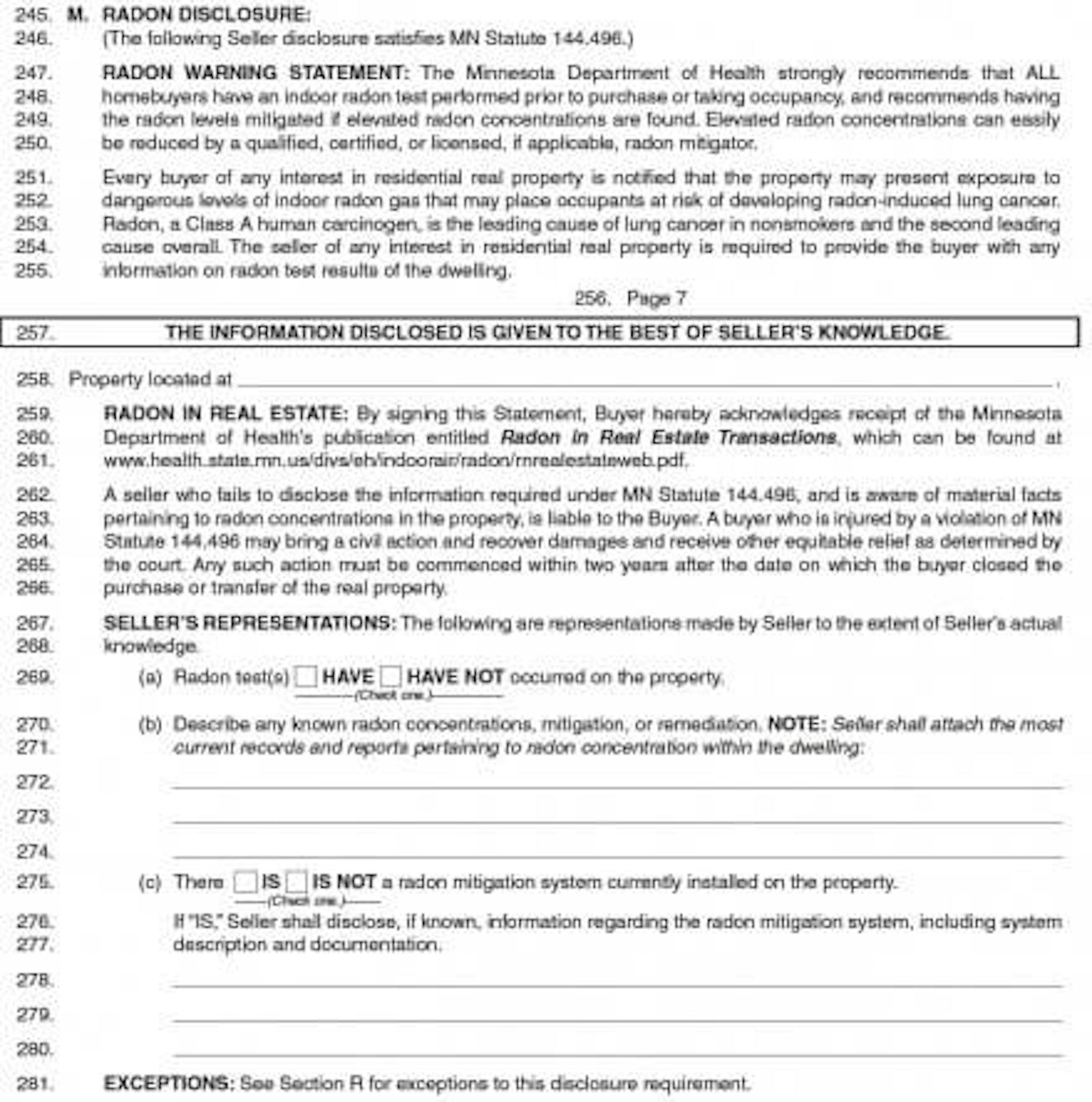 The new Minnesota Radon Awareness Act requires sellers to give home buyers a lot more information about radon, including whether or not tests have been performed, the most recent test results, any details pertaining to radon reduction or mitigation systems, a warning about radon, and a copy of the Minnesota Department of Health publication titled "Radon in Real Estate Transactions".