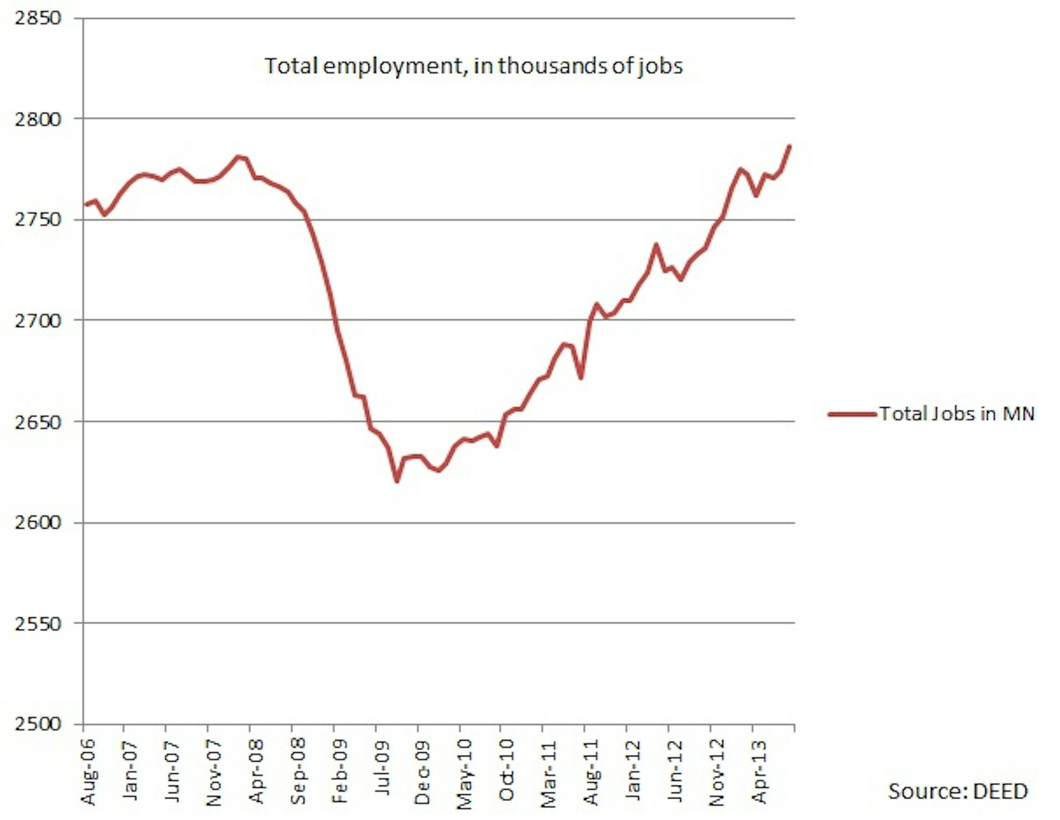 The peak was set in February 2008, when 2.78 million people in Minnesota had jobs.