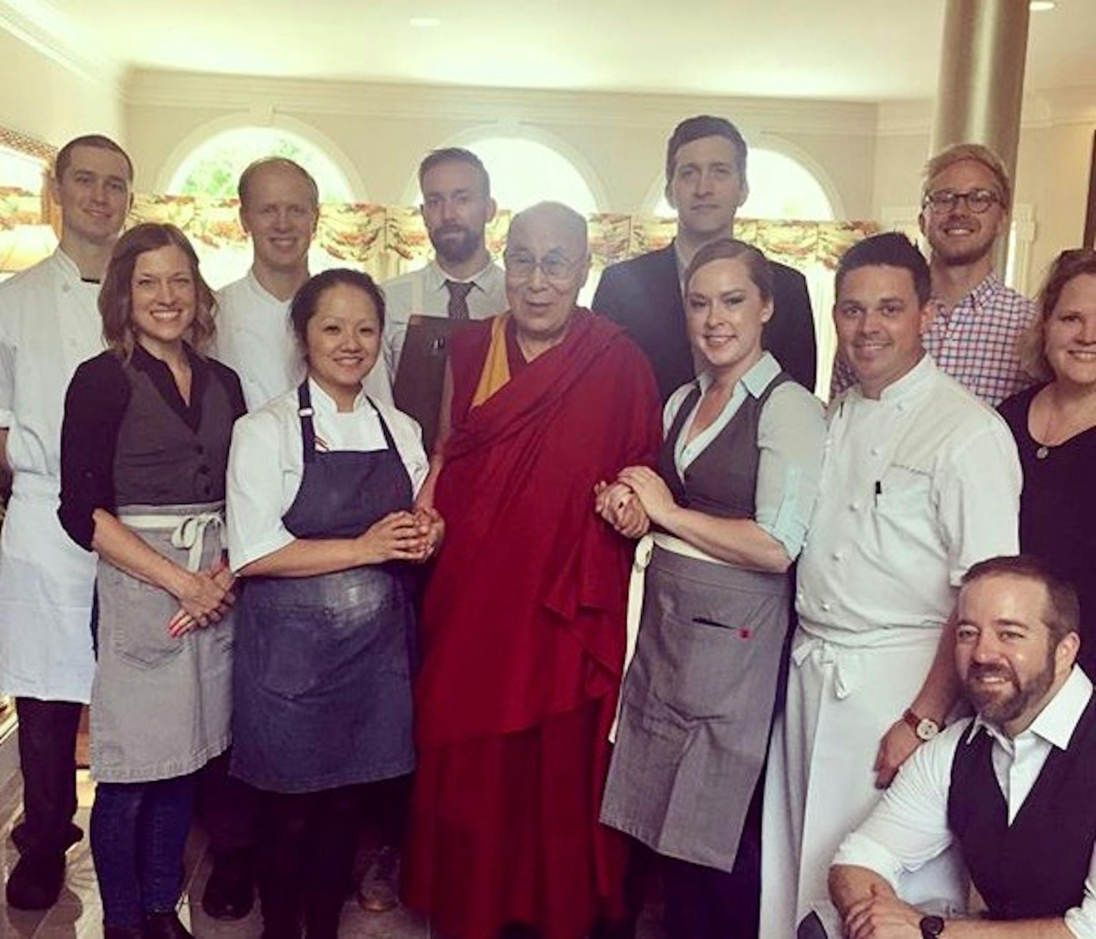 When the Dalai Lama arrived for lunch, he headed to the kitchen, where he greeted Gavin's team and nibbled on some canapes.