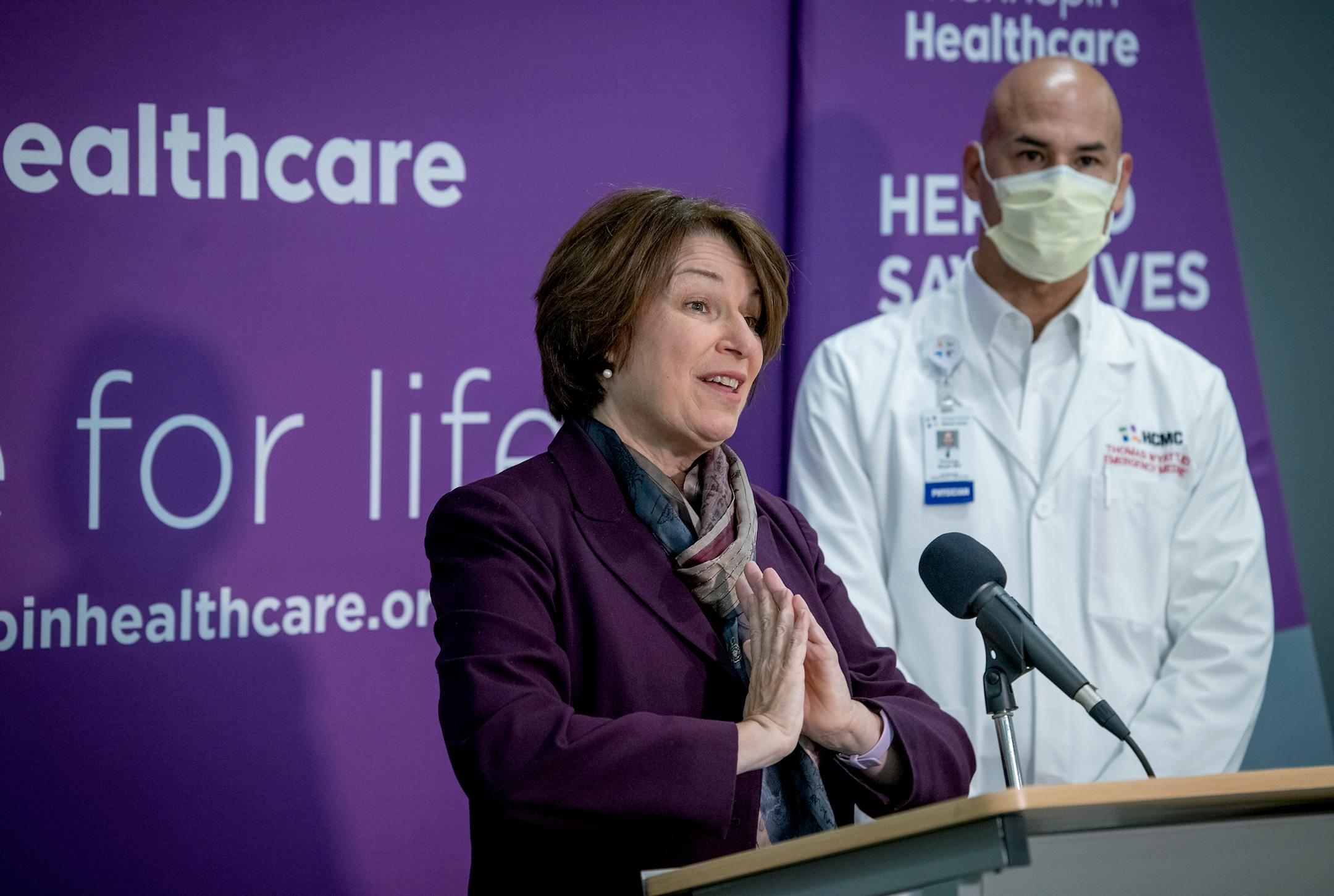 "Our hospitals are getting help, but they're still going to be way overworked," Klobuchar said during a news conference across the street from the hospital. She urged Minnesotans to help by getting vaccinated — either initial shots for those who haven't yet been immunized or boosters for those who qualify.