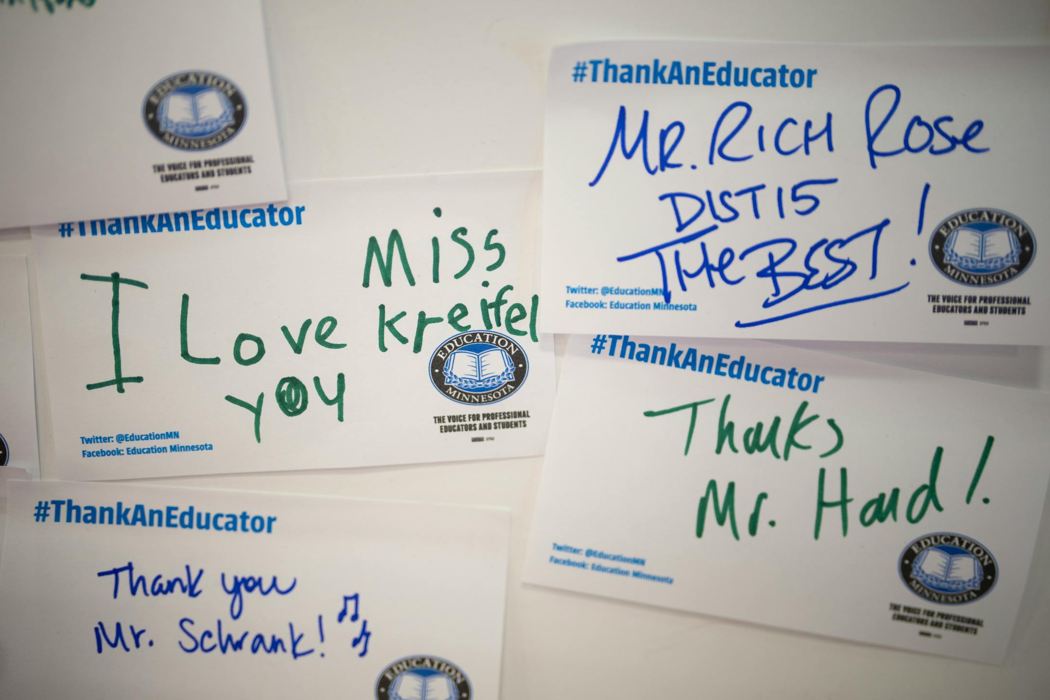 Education Minnesota Vice President Monica Byron said the notes have boosted the moods of teachers who stop by the booth. On Wednesday, one educator was moved to tears by a "thank you" from a former student.