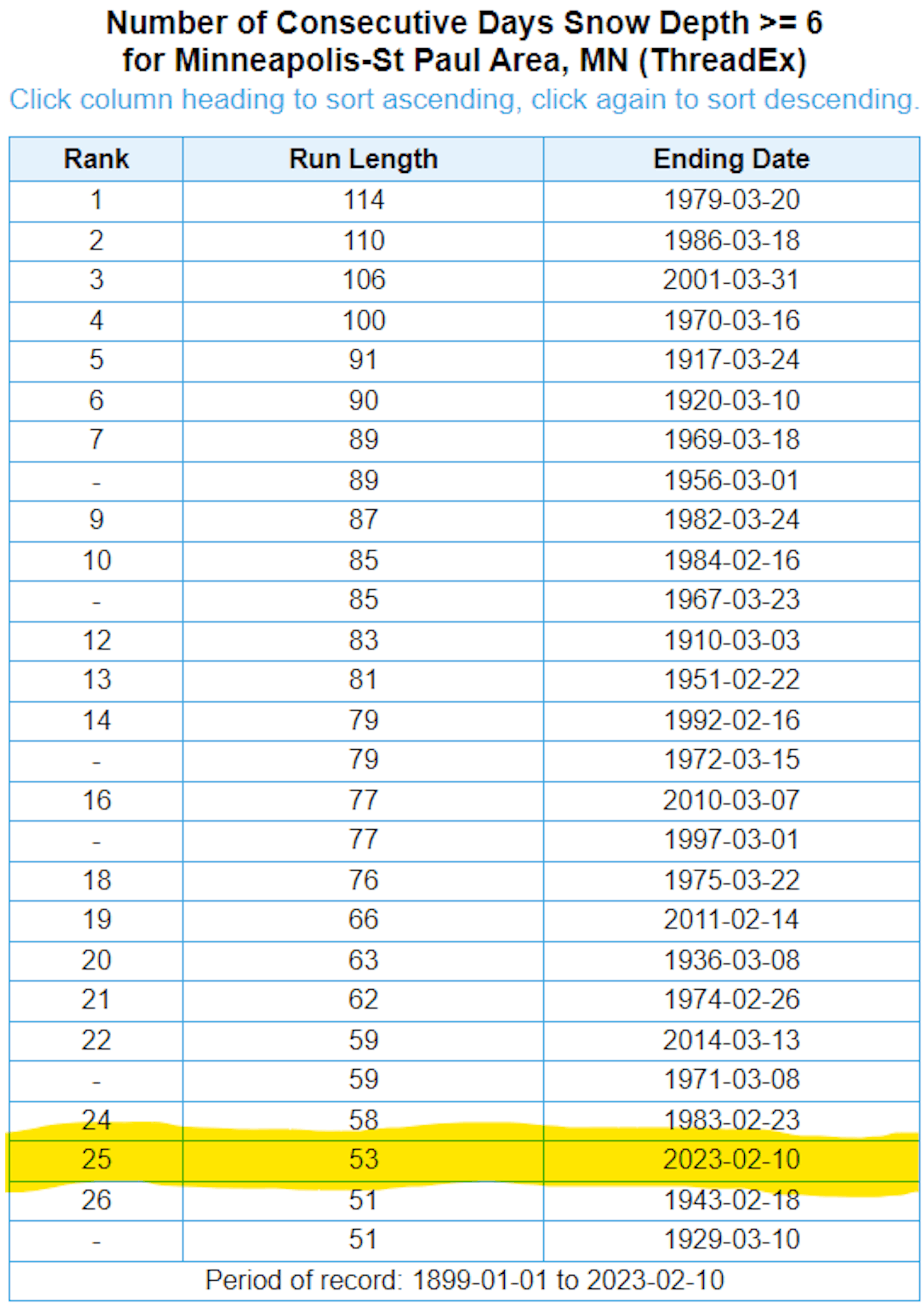25th Longest Stretch of 6" Snow Depth a MSP