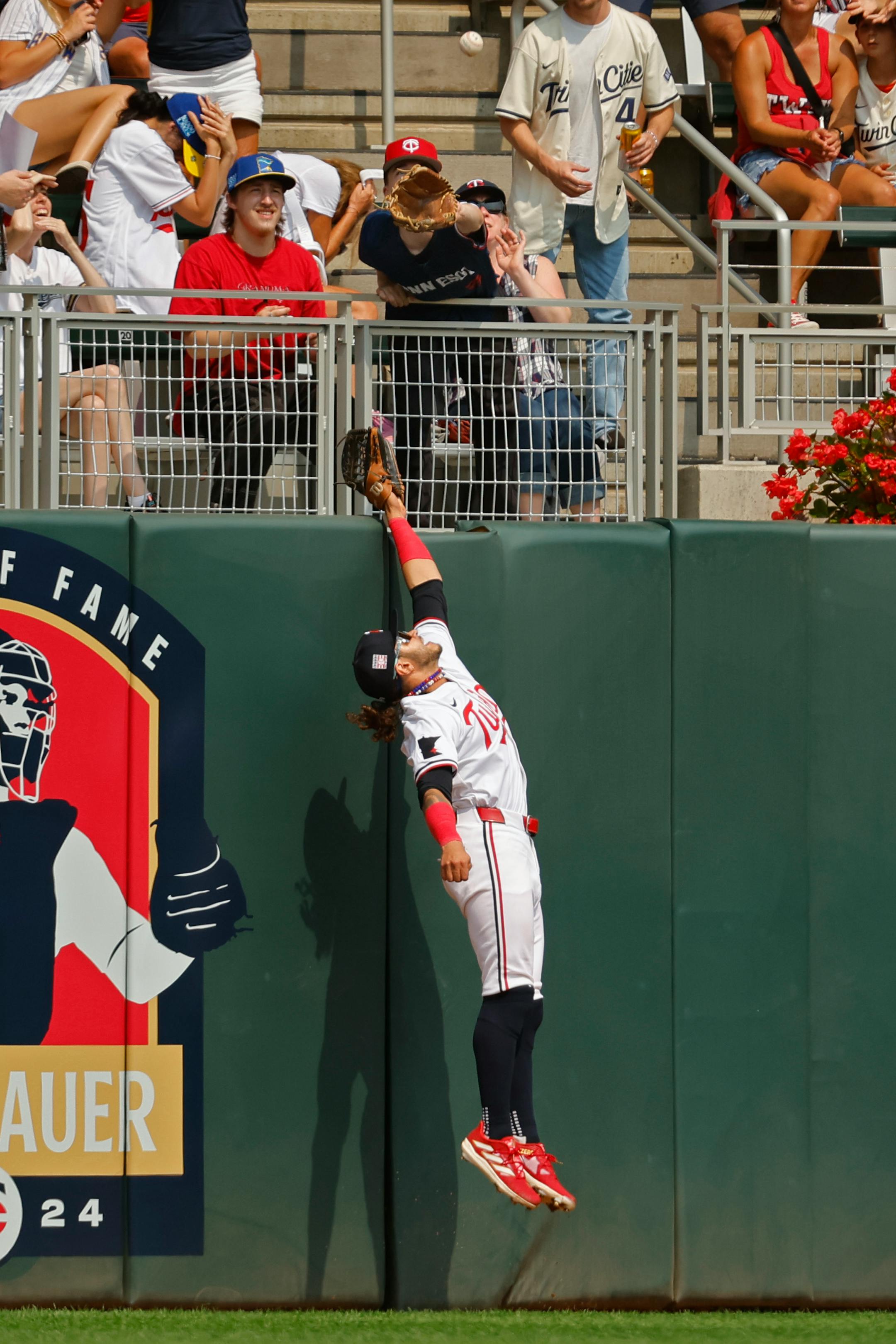 That’s because a fan in a Twins jersey reached out with his glove and made a far easier catch, standing in the front row of the bleachers. It wasn’t quite a Jeffrey Maier moment — that’s the 12-year-old who reached over the Yankee Stadium wall during the 1996 playoffs and caught a Derek Jeter fly ball before Orioles outfielder Tony Tarasco could — but the Twins asked the umpires to have the play reviewed.