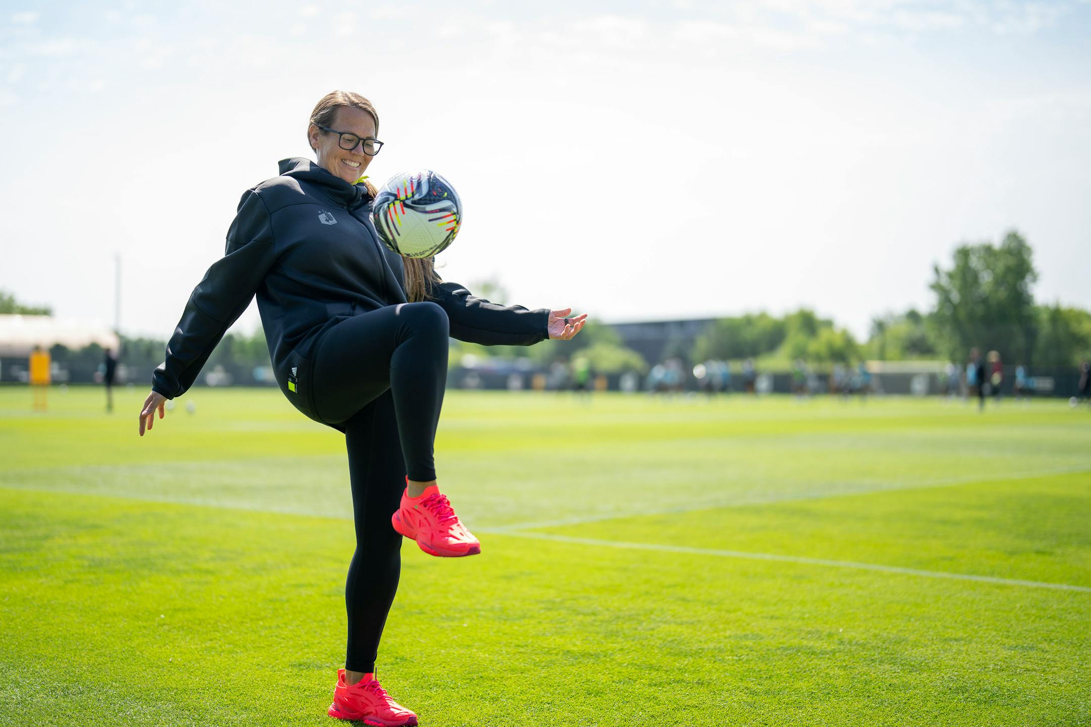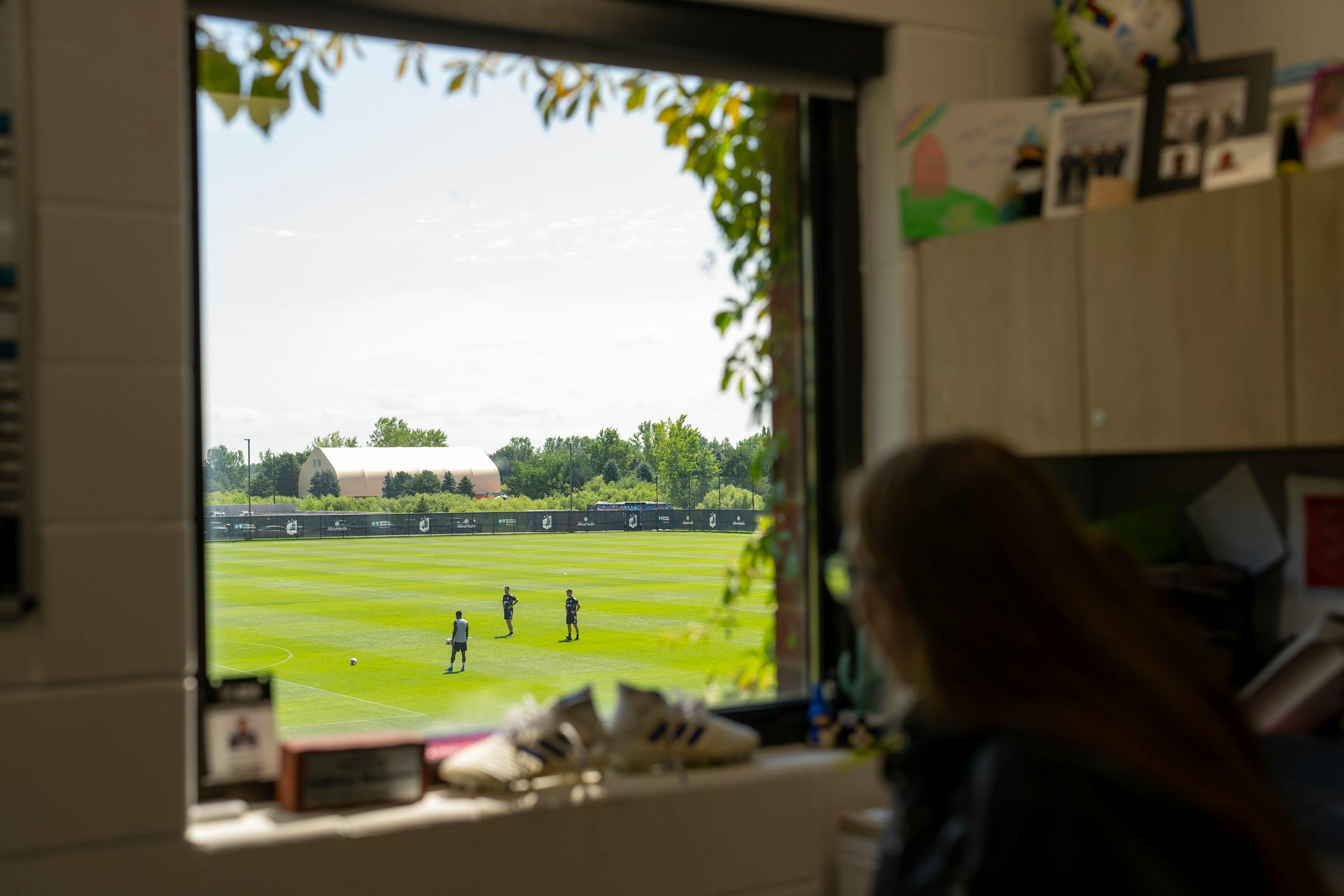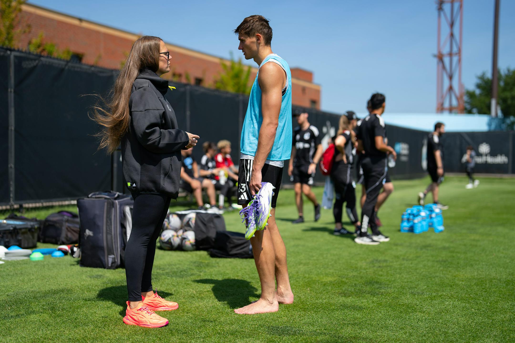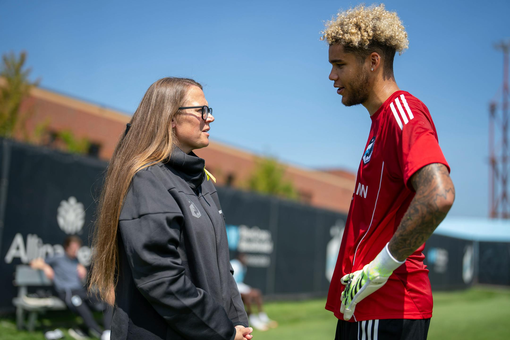 Angie Blaker, head of player care and operations for Minnesota United, chats with defender Morris Duggan after training at the National Sports Center in Blaine. (Alex Kormann/The Minnesota Star Tribune)