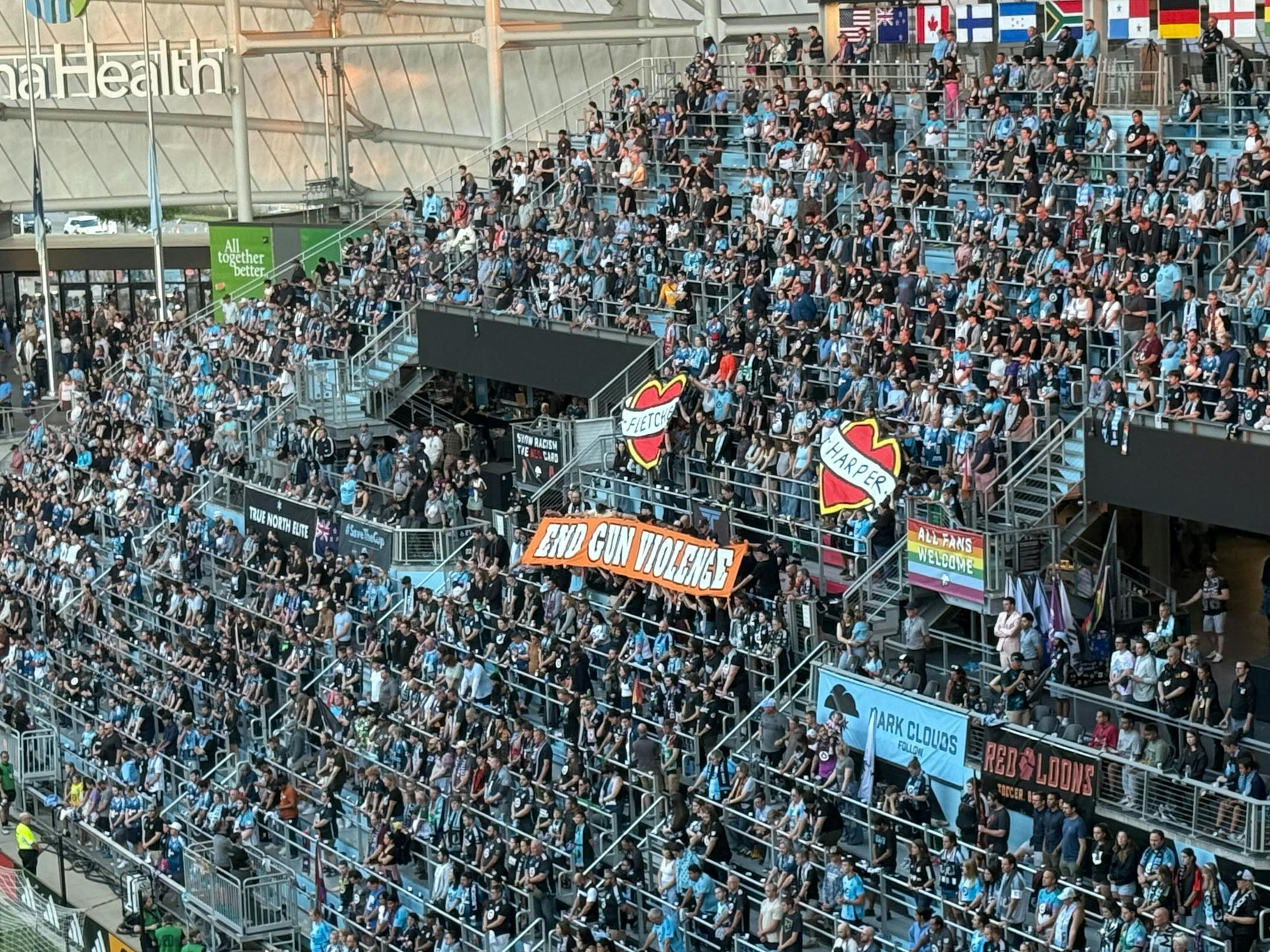 They also displayed a banner reading “End gun violence,” a banner originally created by Austin FC fans following the Uvalde, Texas, school shootings in 2022. The banner was also displayed at a Nashville FC game in 2023 after school shootings there.
