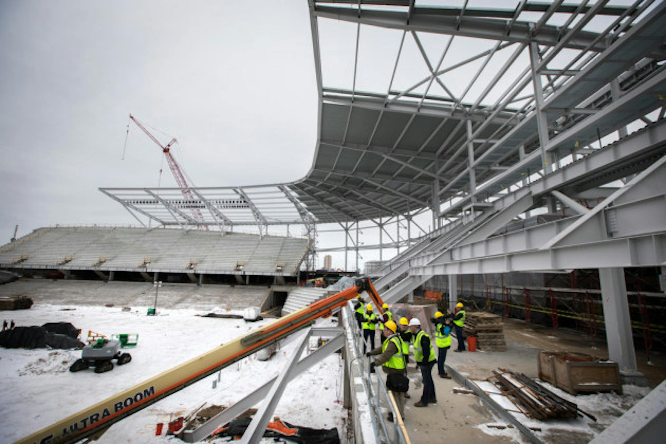 According to project manager Greg Huber, the 20,000-seat soccer-specific stadium in the Midway area of St. Paul is just past 50 percent complete. The crew is still targeting a Feb. 22 completion date and is on track and on budget to meet that, per Huber. Yes, the lingering winter did put a bit of a wrench in those plans, but Huber said with the hard-working crew pulling some overtime, nothing was too delayed.