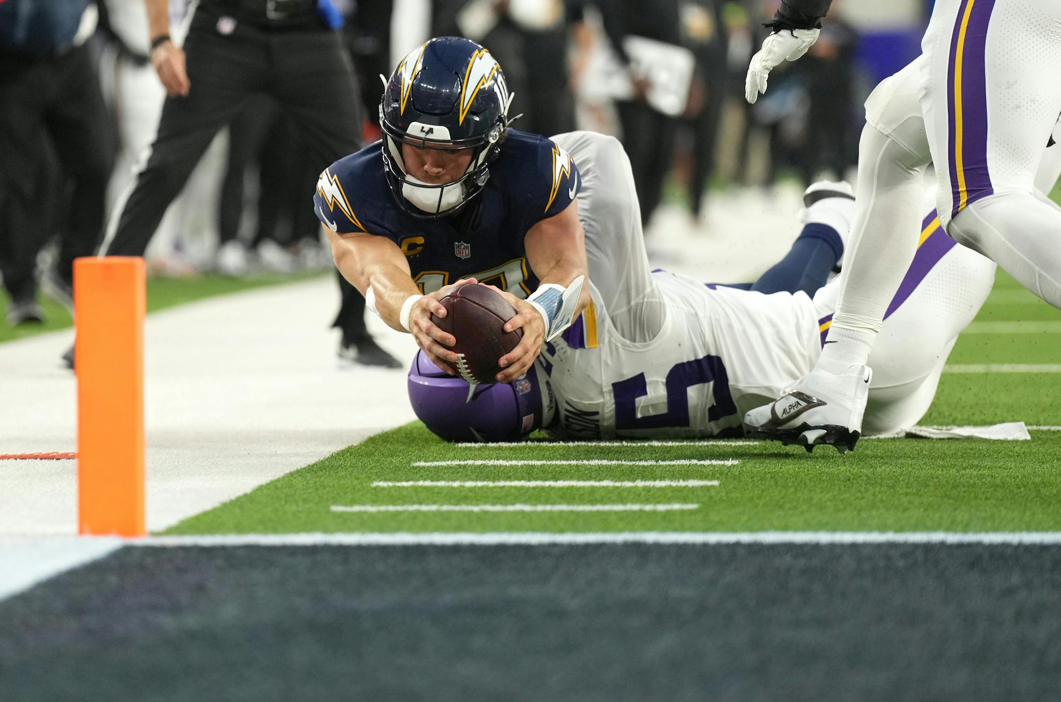 The Vikings (3-4) were outclassed in every phase and exceeded in every metric by the Chargers (5-3), who gained 29 first downs, ran for 207 yards, didn’t punt once and held the ball for 39 minutes. Los Angeles had 10 plays of 15 yards or more; the Chargers posted seven of those plays in the first half alone, when quarterback Justin Herbert strafed the middle of the Vikings’ defense and gained 51 yards on five scrambles of his own. The Chargers had four drives of nine plays or more; their longest drive, a 94-yard march in the second quarter, ended with Herbert lofting a 27-yard touchdown pass over Jeff Okudah’s head for Ladd McConkey, who scored to put them up 21-3.