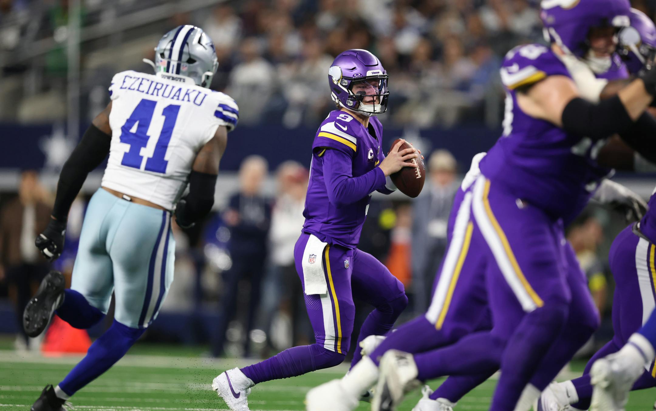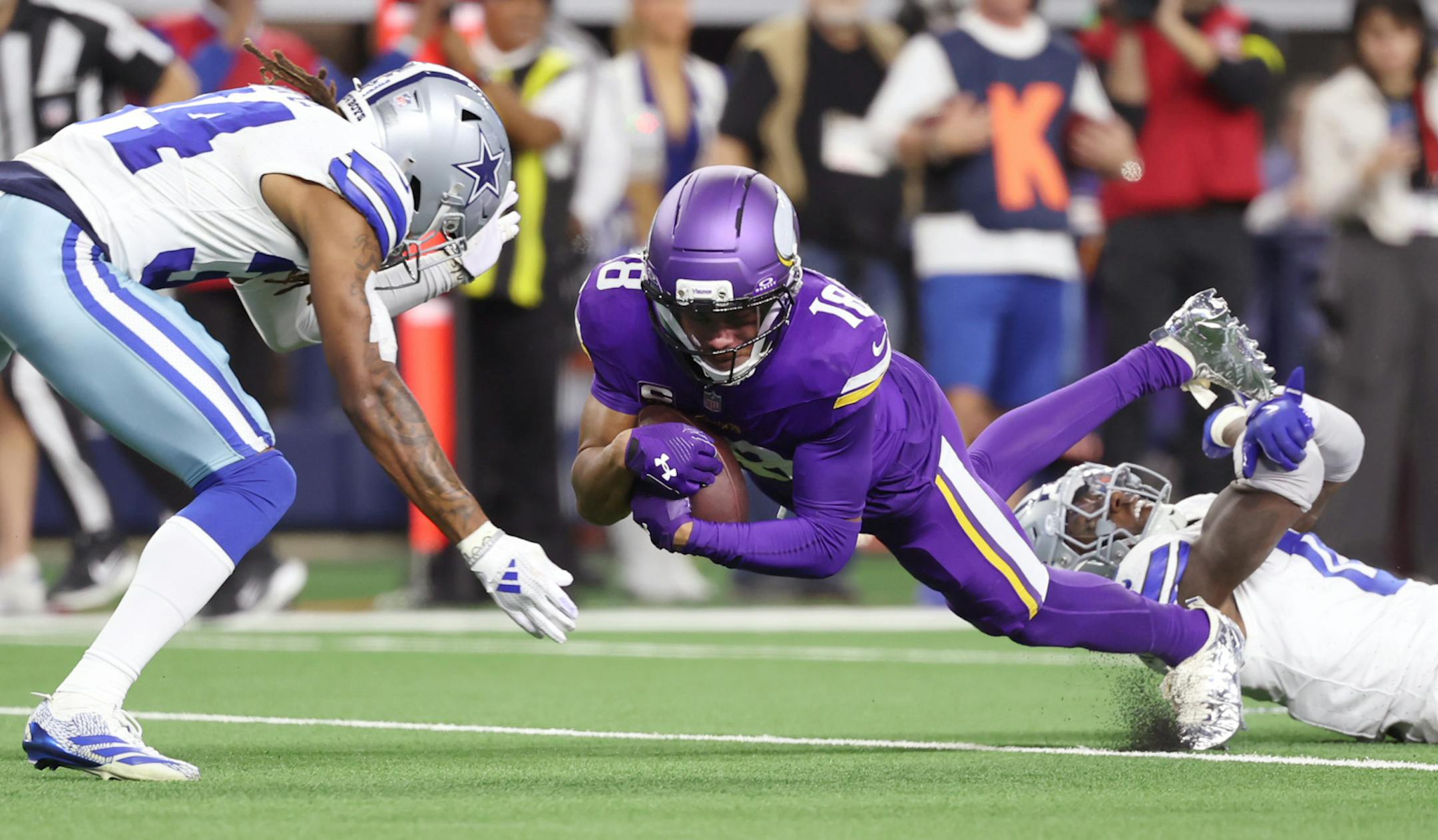 J.J. McCarthy should thank Justin Jefferson every day for being patient, understanding and everything else that a typical star wide receiver isn’t. Jefferson was targeted eight times in Sunday night’s 34-26 win at Dallas. He caught two balls for 22 yards and is still 168 yards from reaching 1,000 this season. He was overthrown while wide open. He had a touchdown nullified by a pre-snap penalty. And yet there he was late in the first half of a 14-14 game blocking like a left tackle on a running play. He fired off the line of scrimmage and popped defensive back Caelen Carson three times with legal blocks as Aaron Jones gained 7 yards to the Dallas 14. Carson didn’t like the rough stuff, so he started swinging. His unnecessary roughness penalty superseded a pre-snap penalty on the Vikings and made it first-and-10 at the Dallas 11 instead of first-and-15 from the 26. Jefferson is a special receiver, and not just because of his catching ability.