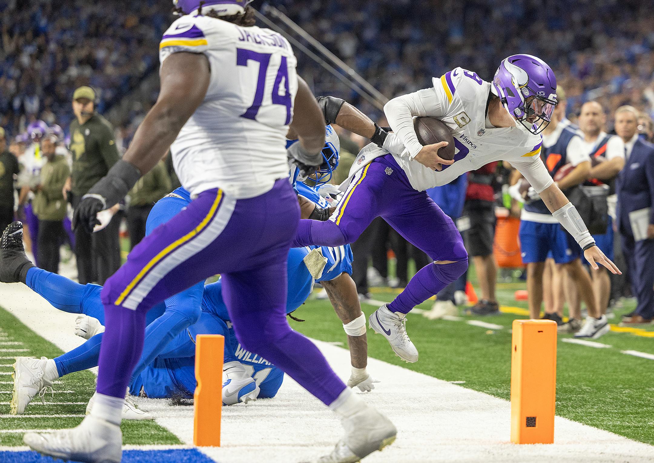 In a wildly entertaining and uneven performance Sunday, the Vikings’ once-and-current starting quarterback led what is certainly his franchise to a 27-24 victory over the Detroit Lions at Ford Field.