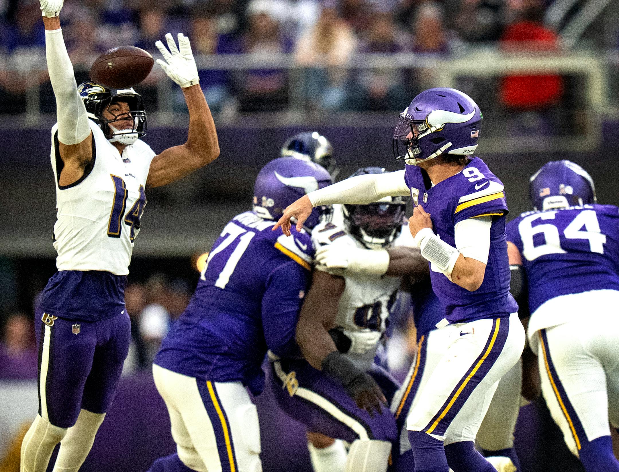 In each game since that surprising Monday night win over the 49ers that seemed to turn around the Vikings’ 2023 season, the team had allowed at least one sack. That streak ended Sunday, when the Vikings kept McCarthy from being sacked the entire game and the Bears pressured him on just nine of his 32 dropbacks. But Chicago’s pass rushers became the latest to affect McCarthy another way: by getting their hands up.
