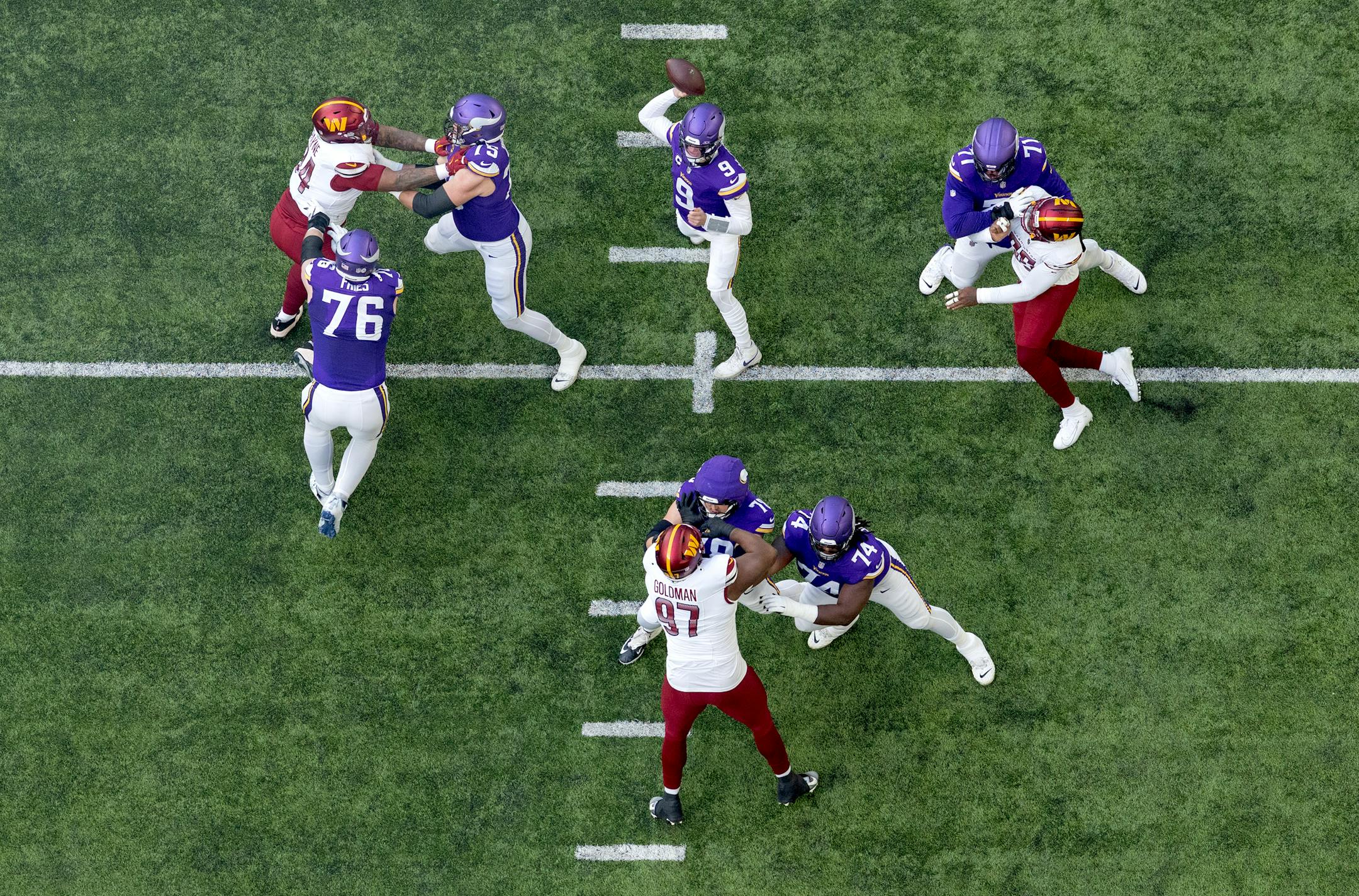 We should begin with the necessary caveats: The Vikings had all five of their preferred starting offensive linemen on the field for an entire game for the first time this season. They were playing at home. They had the lead for 56 minutes, 3 seconds after scoring a touchdown on the game’s opening drive. And they were playing a Washington Commanders team that had lost seven in a row, including back-to-back overtime games in different countries, and arrived at U.S. Bank Stadium with little to play for.