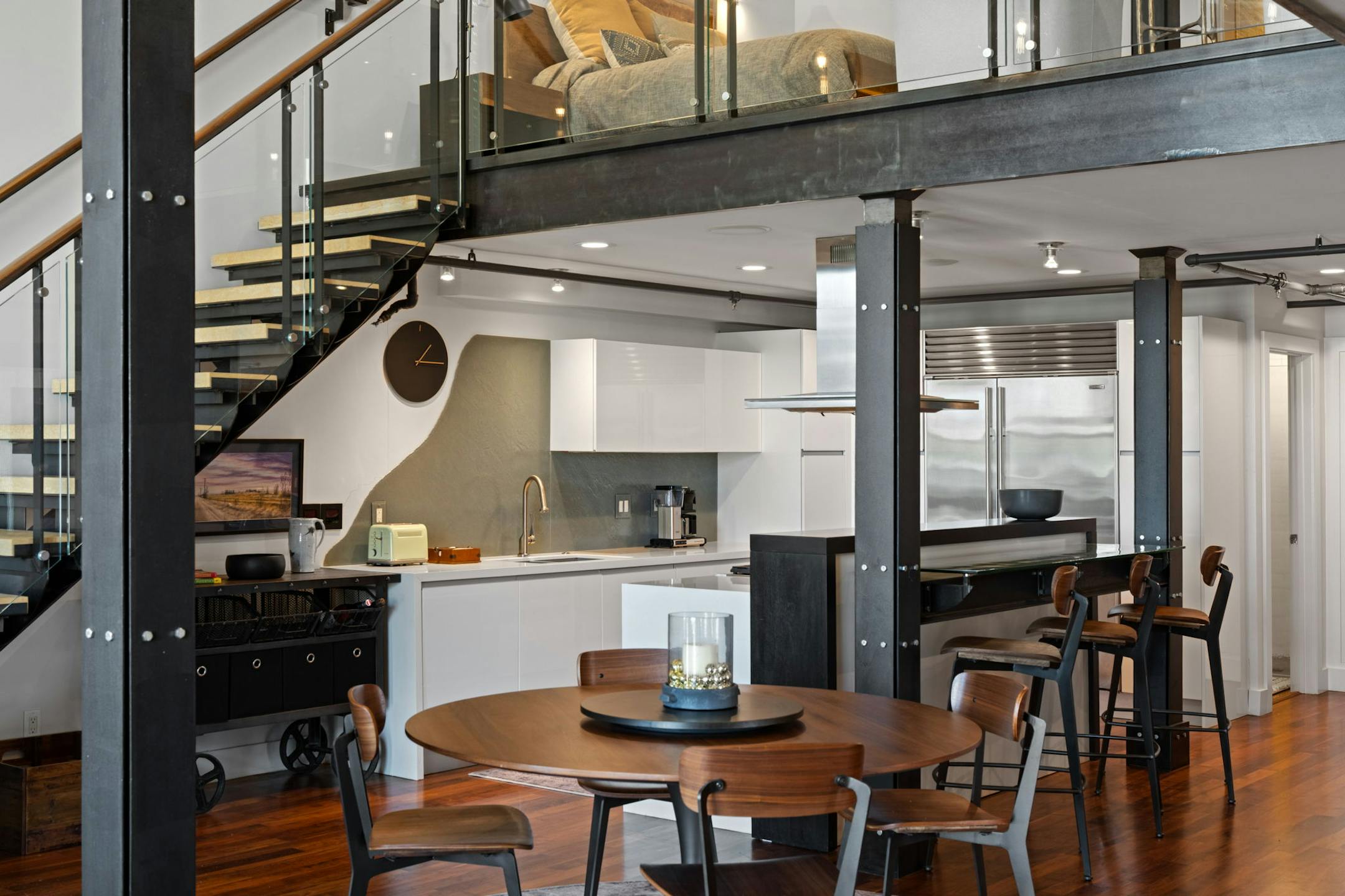 The home is in the Whitney Lofts, a brick-and-timber building at the corner of Portland Avenue and West River Parkway in the Mill District. The neighborhood stretches along the downtown side of the Mississippi River.