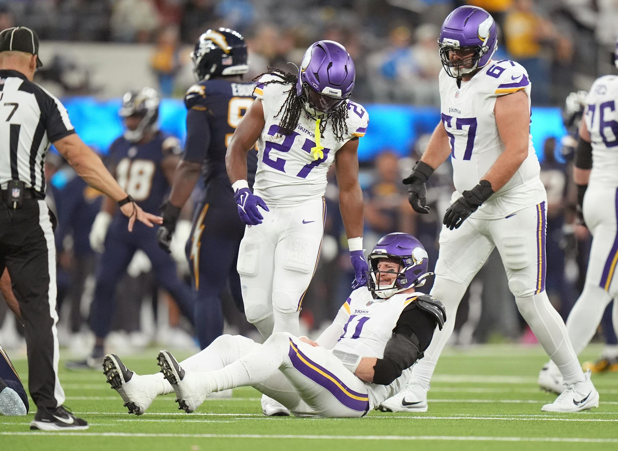 The Vikings played without right tackle Brian O’Neill, who sat out because of left knee soreness after playing the Eagles game with a sprained right MCL, and left tackle Christian Darrisaw, who tore his left ACL a year ago, came out after nine snaps because of concerns about how his knee felt.