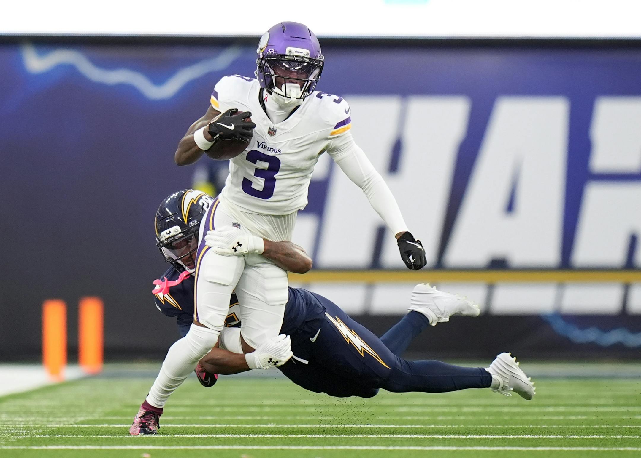 Vikings wide receiver Jordan Addison (3) changed helmets this season to the one Justin Jefferson wears. (Jerry Holt/The Minnesota Star Tribune)