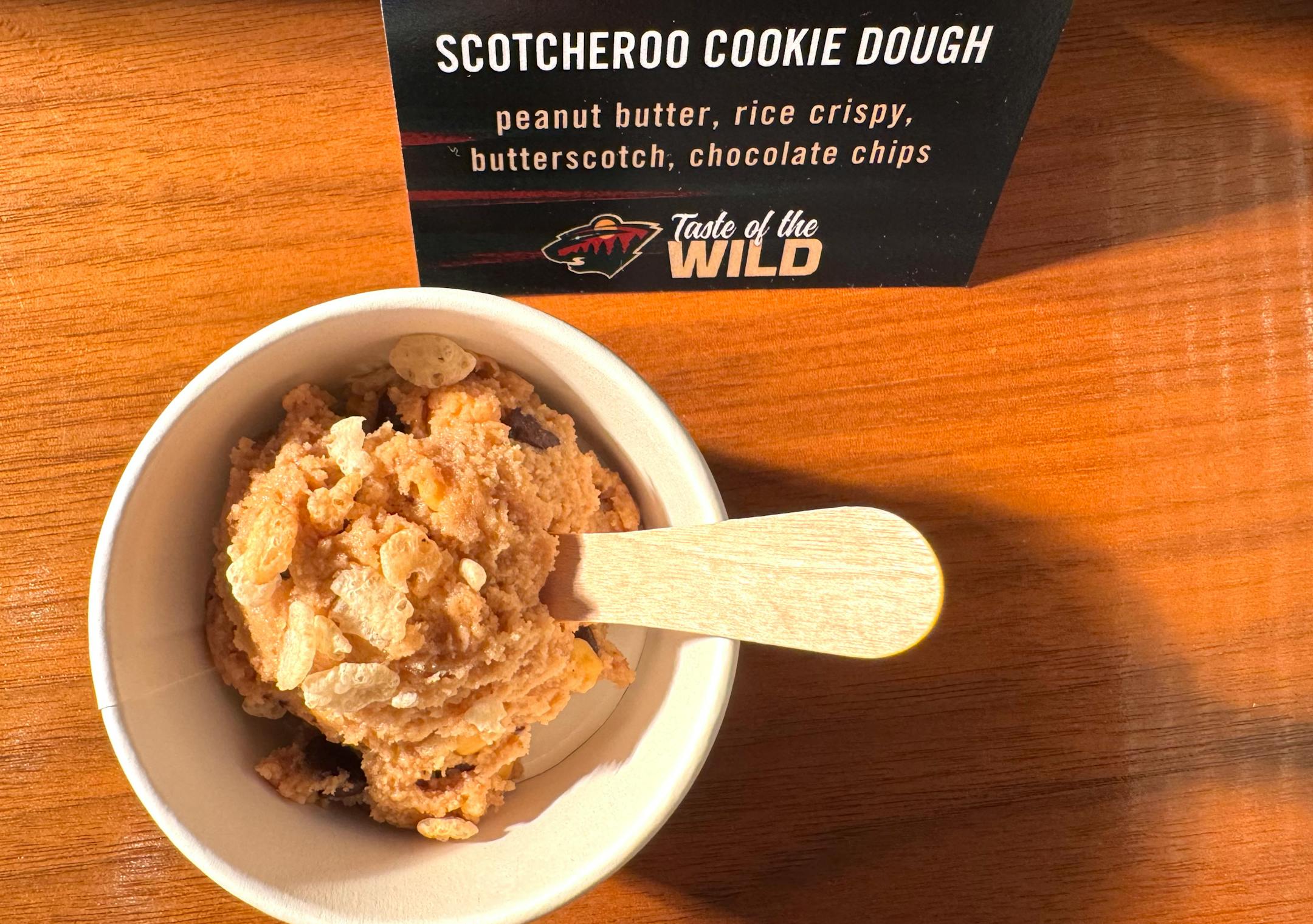 Edible cookie dough (meaning it contains no raw flour or raw egg) is a sweet treat, scoopable like ice cream but thick as Nutella on a spoon. There are two new flavors: the Thin Mint-inspired chocolate mint with chopped up Andes candies; and one inspired by a Minnesota potluck favorite, Scotcheroos. The latter is a peanut butter dough with rice cereal for crunch, studded with chocolate and butterscotch chips. If you could spoon-feed yourself a funeral bar, this would be it.
