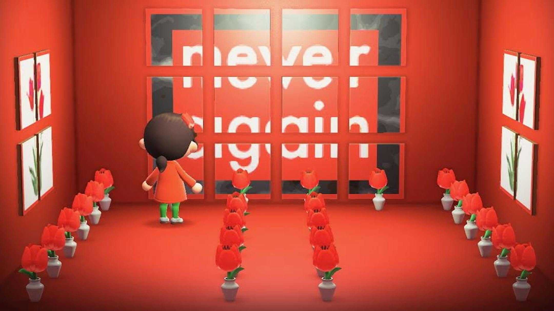 Above: Screenshot from Mark Schoening's "The Red Tulip Glitch Memorial" at the Museum of Contemporary Art Kittengale (MoCAK) in "Animal Crossing: New Horizons."