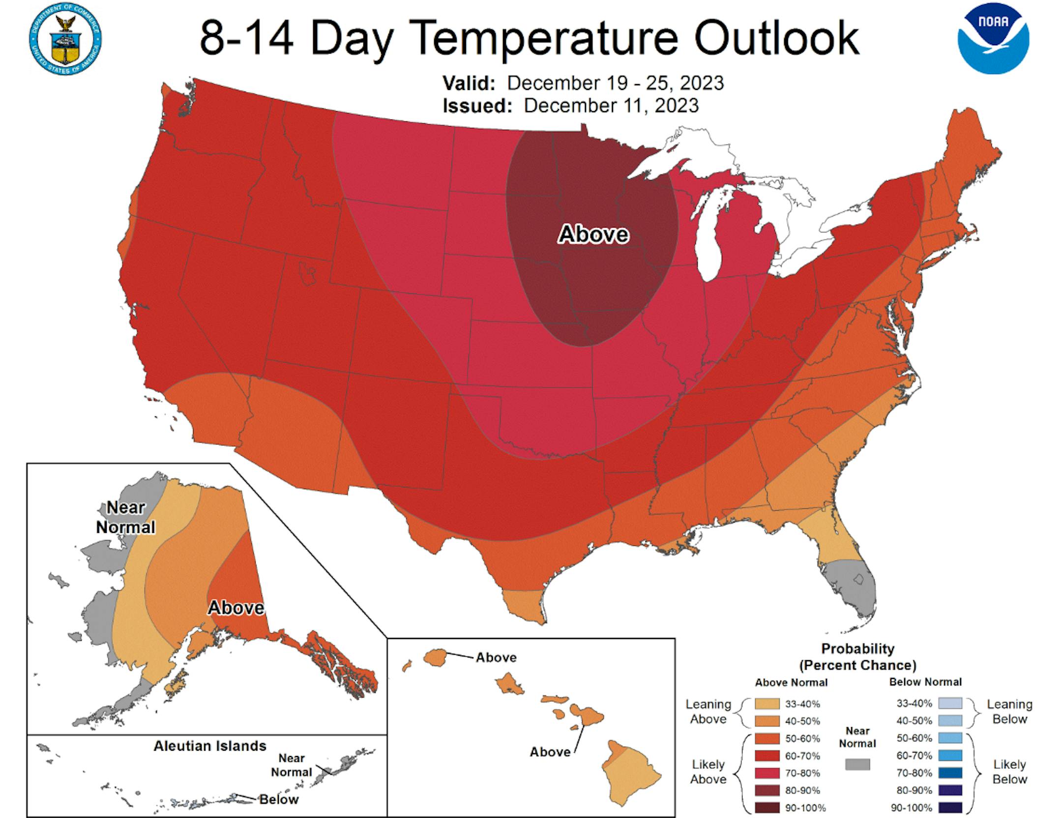 The 5 day temperature outlook for Minneapolis will be chilly on Tuesday with readings running a little below average for mid-December. We'll see quite a bump by the 2nd half of the week with highs warming into the 40s once again, which will be nearly +15F above average.