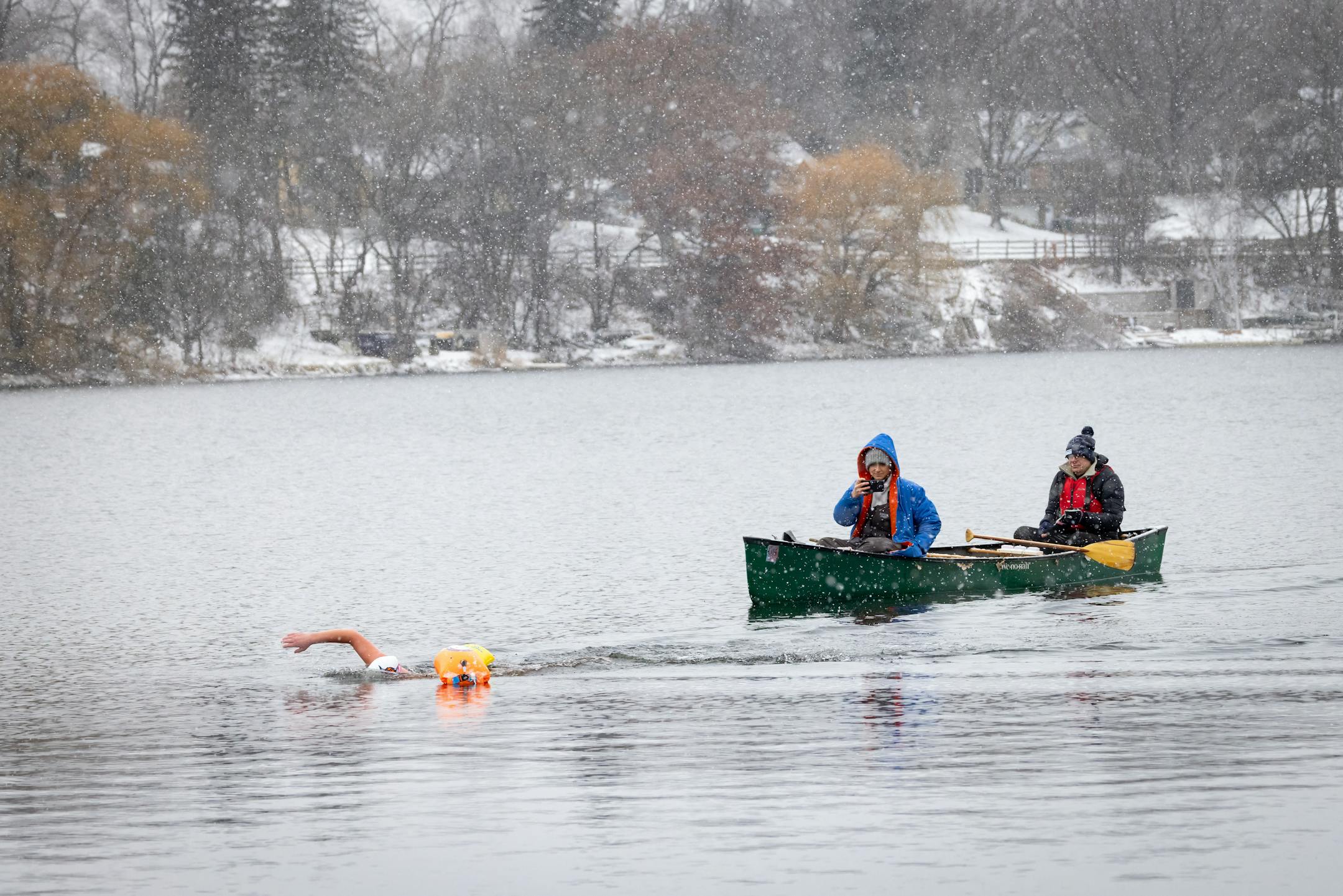 Heather Lendway, a member of Koeck’s swimming friends group, was in the bow of a canoe to ensure Koeck was physically OK. Robert King was the witness and took water temperature readings. Flakes of ice formed on the gunwales and crusted the temperature gauges.