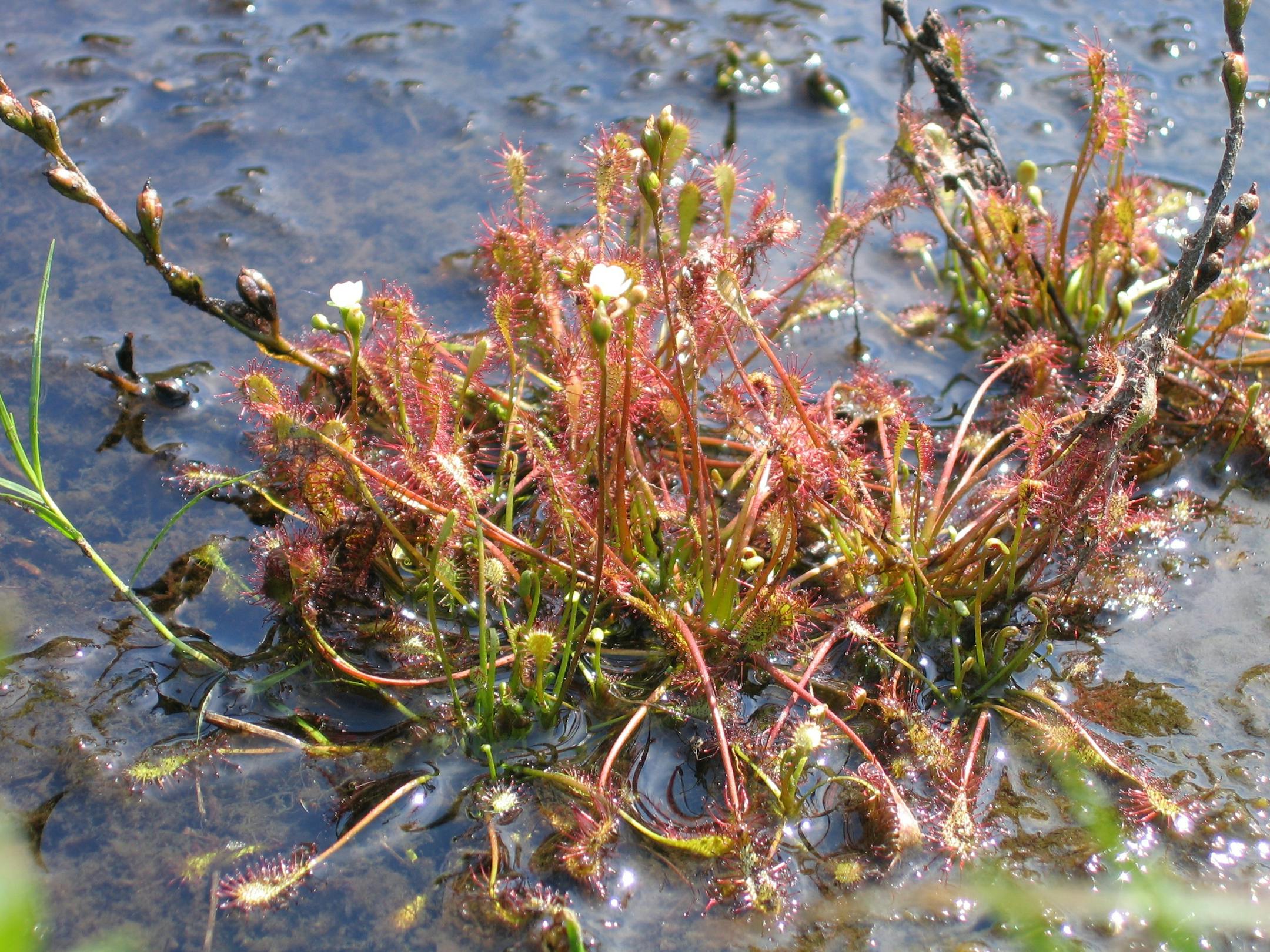 Sundew plants, which may be only a few inches to 10 inches tall, feature tiny round leaves edged with red hairs. They exude a sticky substance that acts like flypaper, luring and trapping mosquitoes and other insects until the plant can close leaves around them. It can take a few weeks to digest their dinner with acids or enzymes.