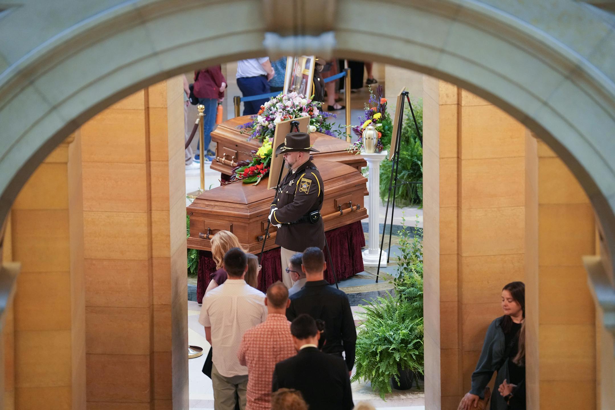 Yellow blooms spilled across Mark Hortman’s coffin. Tucked between the Hortmans’ coffins was the urn for Gilbert, their dog. All were victims of the political violence that terrorized the state two weeks ago, and so in a way were the thousands who streamed in to pay their respects.