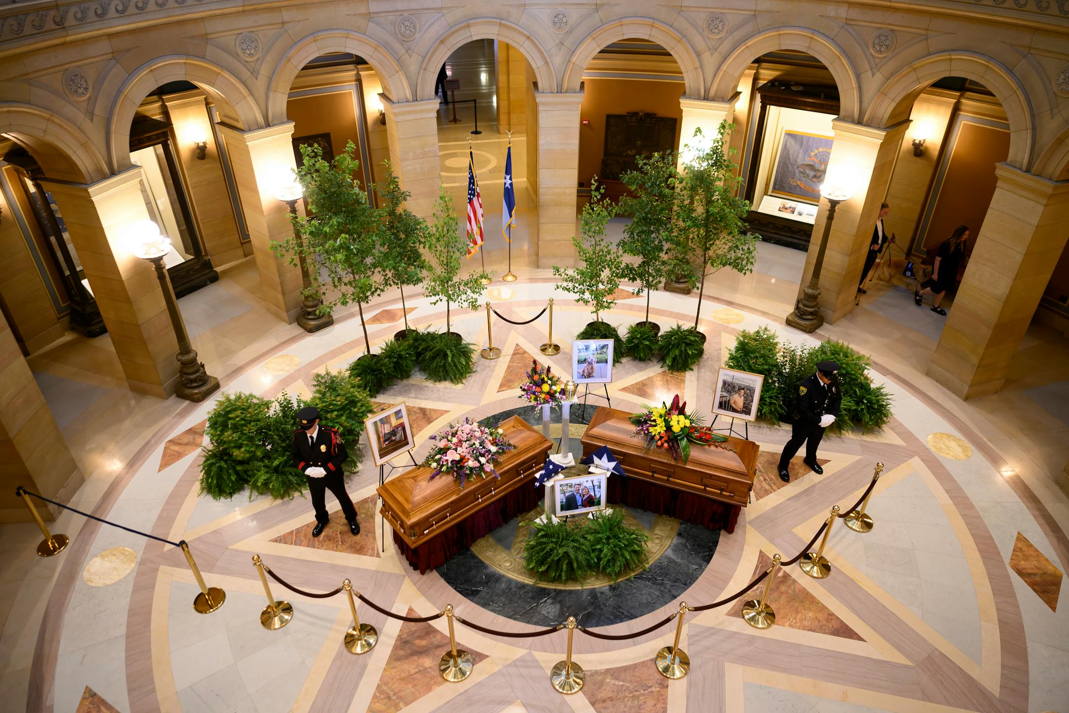 Hour after hour, mourners filed into the rotunda where Hortman, speaker emerita of the House, lay in state alongside her husband, Mark Hortman, and their golden retriever. Visitors stared numbly at the flowers, the soaring underside of the dome, the framed photos of the Hortmans’ smiling faces. Some carried bouquets to add to the piles of flowers that were starting to wilt on the memorials outside the House chambers.