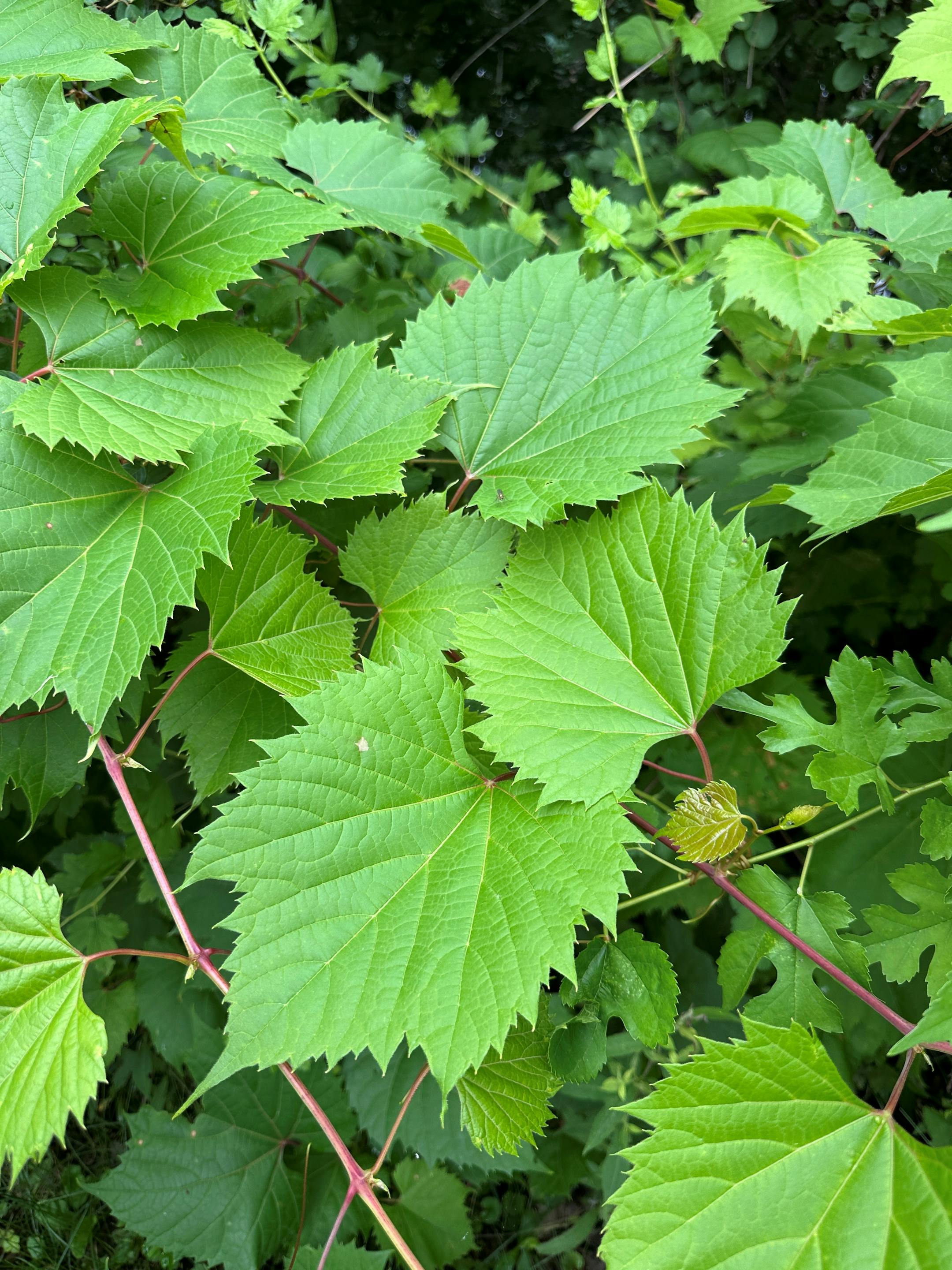 Vines can be slow to leaf out in the spring, but later their leaves grow to palm-sized and offer dense, shady cover for wildlife. The fruits — more petite than domestic Concord grapes but hanging in similar clusters with similar leaves — offer an important early-fall food source for birds and mammals.