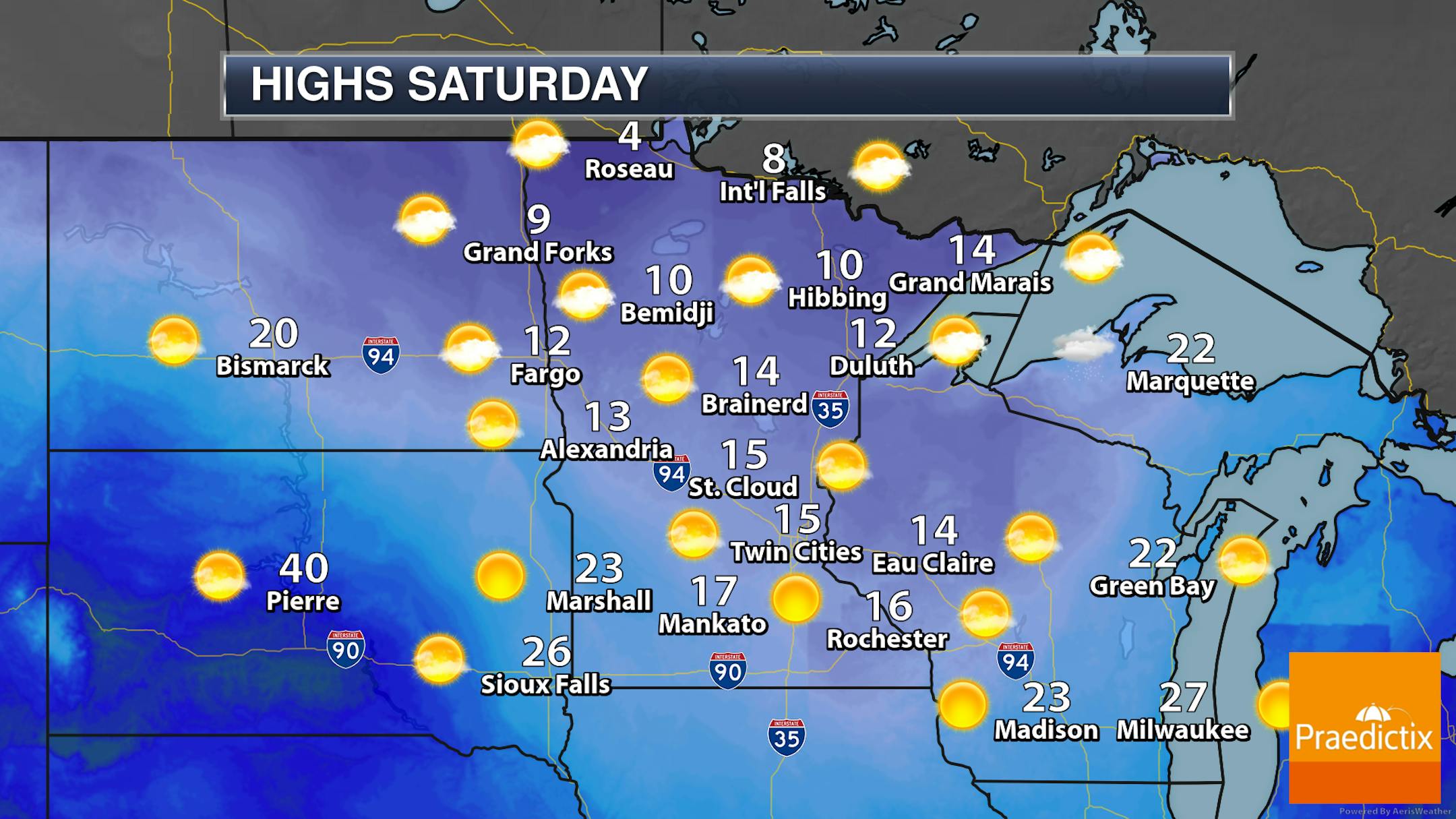 The big concern across the state Saturday will be the cold air in place. While we could see a few 20s in southwestern Minnesota, it'll be in the single digits (above zero, thankfully) and teens across the rest of the state. We'll see a mix of sun/clouds to mainly cloudy skies across northern Minnesota, with sunnier skies from central Minnesota southward.