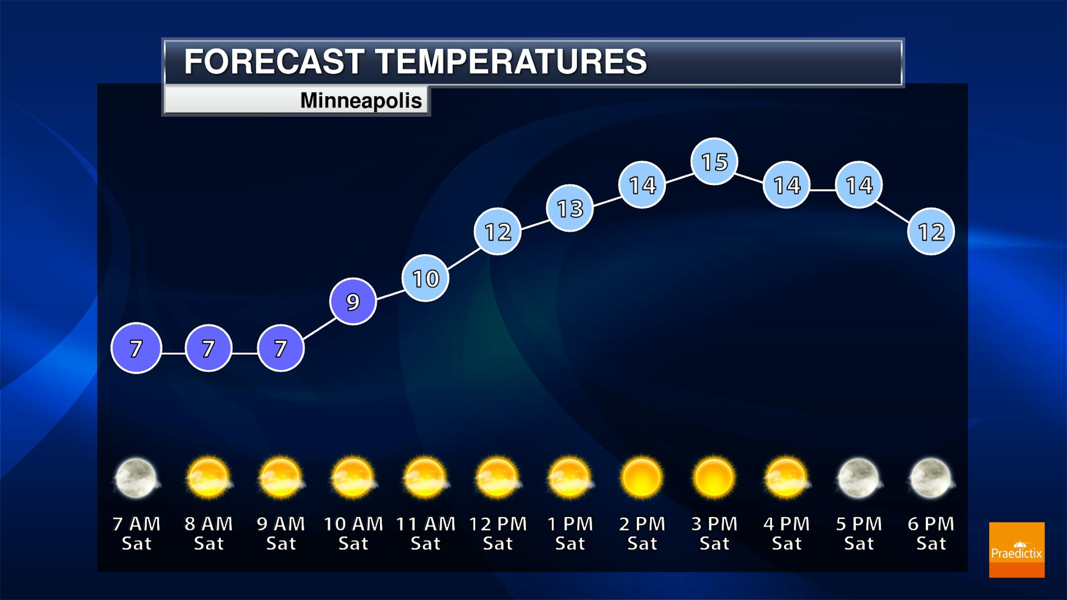 Saturday will be a day of misleading sunshine in the Twin Cities. Morning temperatures will start off in the mid-single digits (feeling more like the single digits below zero), climbing only to the mid-teens for highs. We'll still see strong winds - out of the west-northwest to begin the day but becoming southwest - sustained at 5-15 mph. These winds won't be as strong as they were Friday and Friday Night, though.