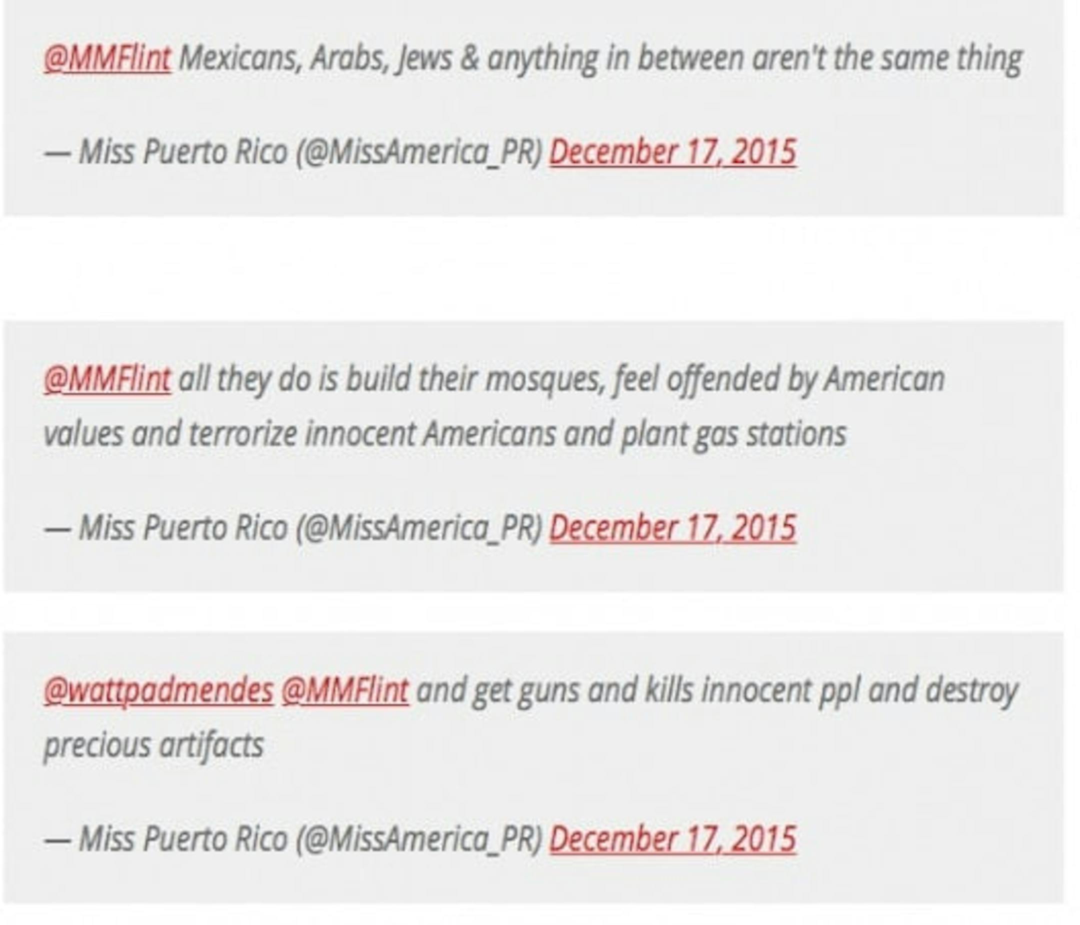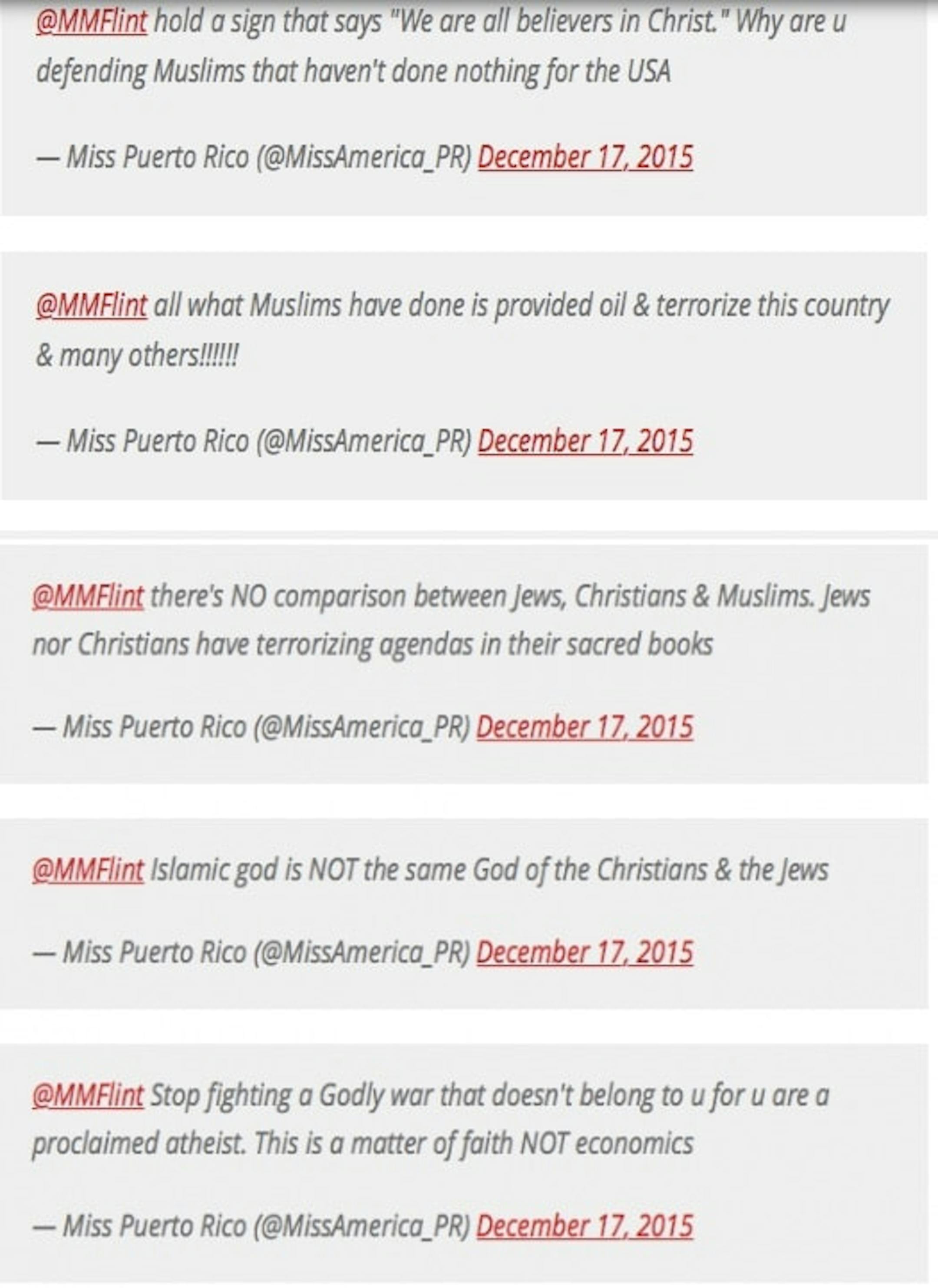 Miss Puerto Rico was suspended from the Miss America pageant on Sunday after going on a Twitter tirade against Muslims and filmmaker Michael Moore.