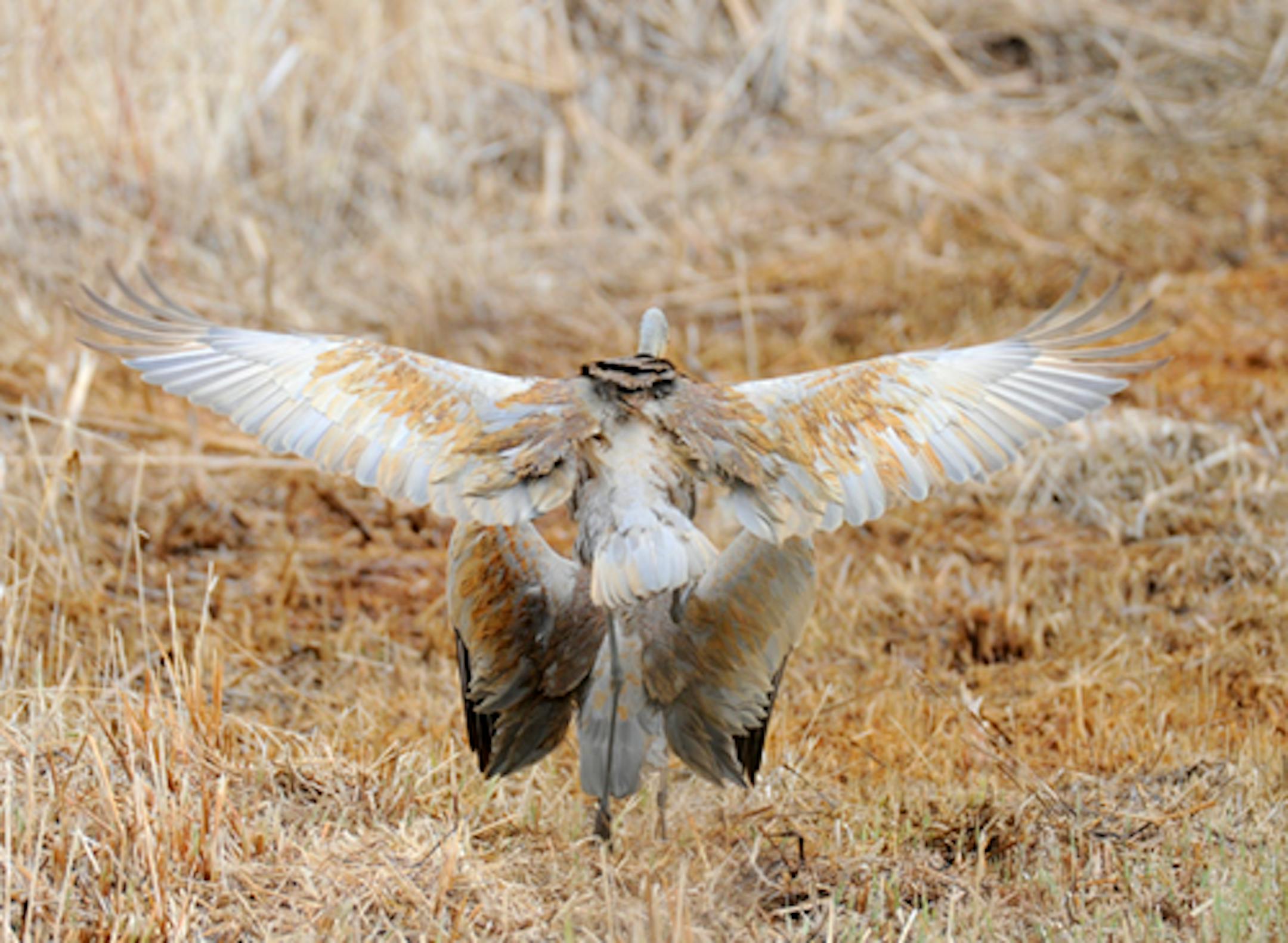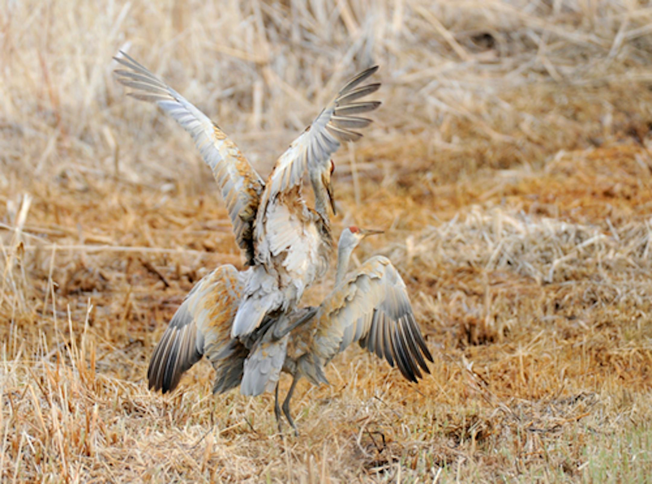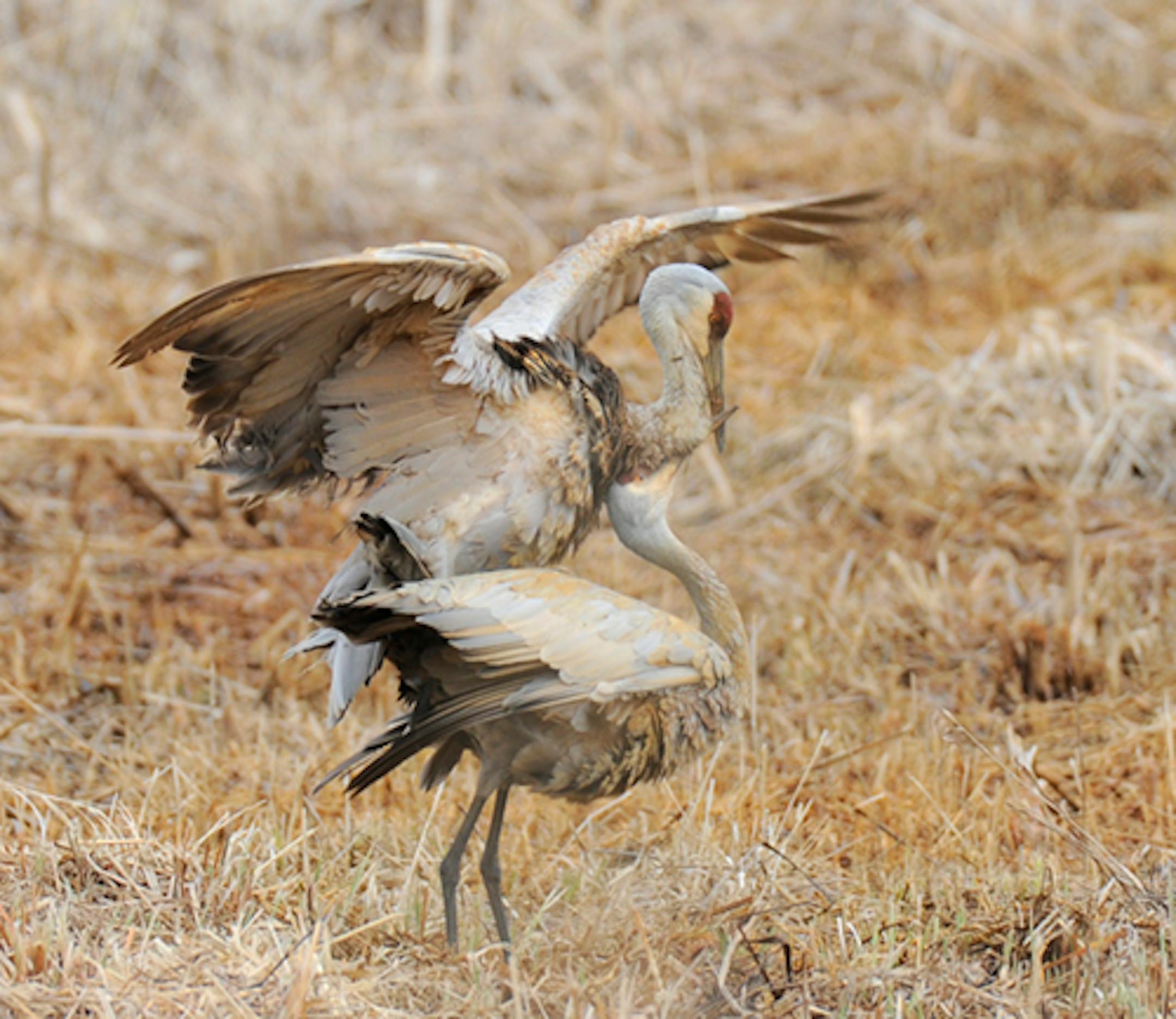My daily checks on the lone Sandhill Crane hanging out in a meadow west of our home have produced just the one bird, except today. There was a pair. I parked at a vantage viewing point, hoping to see courtship dancing. I missed that, as confirmed by what I did see -- the cranes mating. Sometimes the best thing you can be is lucky.