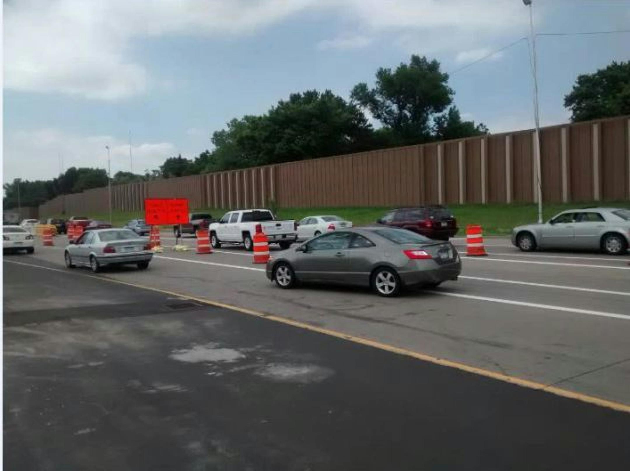 The problems are coming near Rice Street just before drivers reach the construction zone. Barrels were set up at Rice Street to block the center lane and funnel traffic into the left or right lane. The arrangement prevents motorists coming off the ramp from northbound I-35E to westbound I-694 to access the left, or "Through" lane.