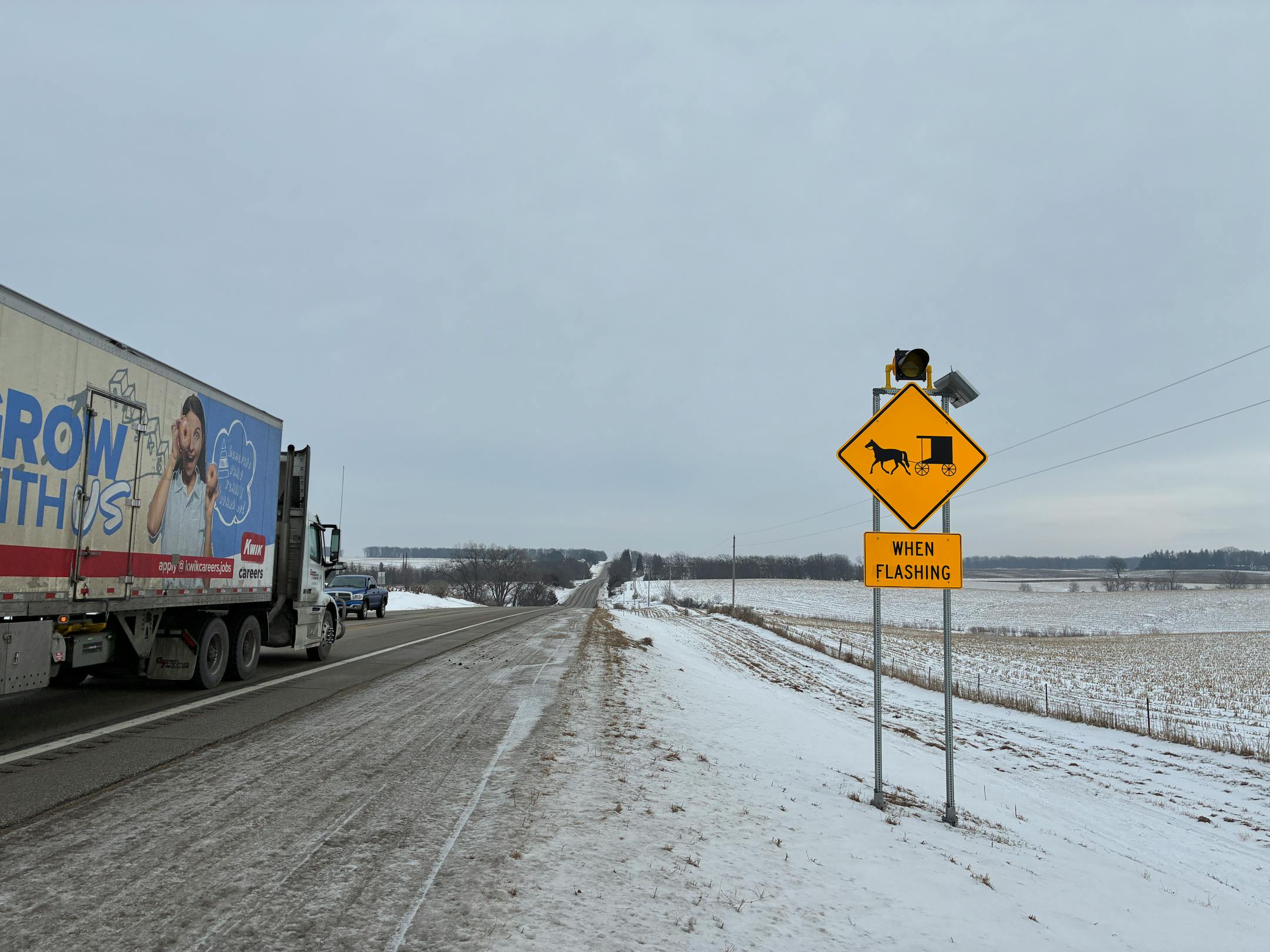 Horse-drawn buggies are a common sight on the two-lane highway, which runs through one of the state’s largest Amish communities. They primarily travel on the shoulder as about 2,200 vehicles a day, including semis, roll past them at 60 mph or faster.