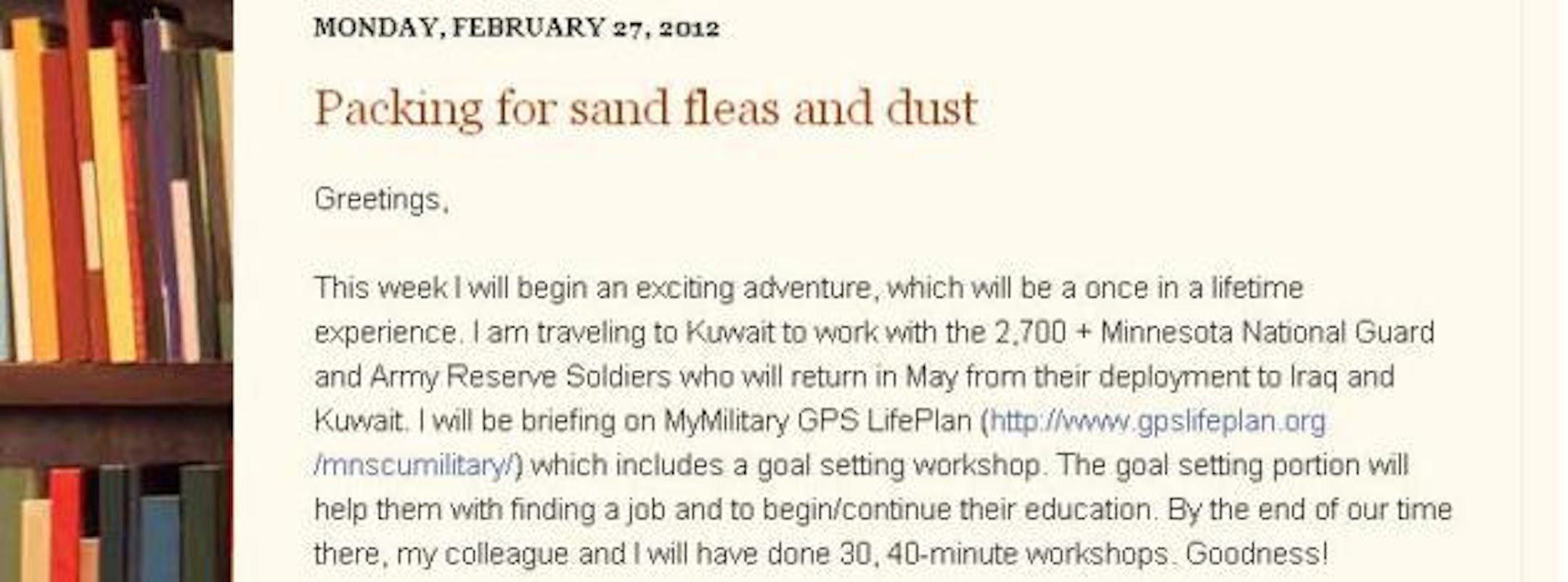 MnSCU is sending Gina Sobania, the system's military education director. She will be working with soldiers on using My Military GPS LifePlan, an online tool to help veterans and service members plan a successful transition to civilian life, a spokeswoman said.