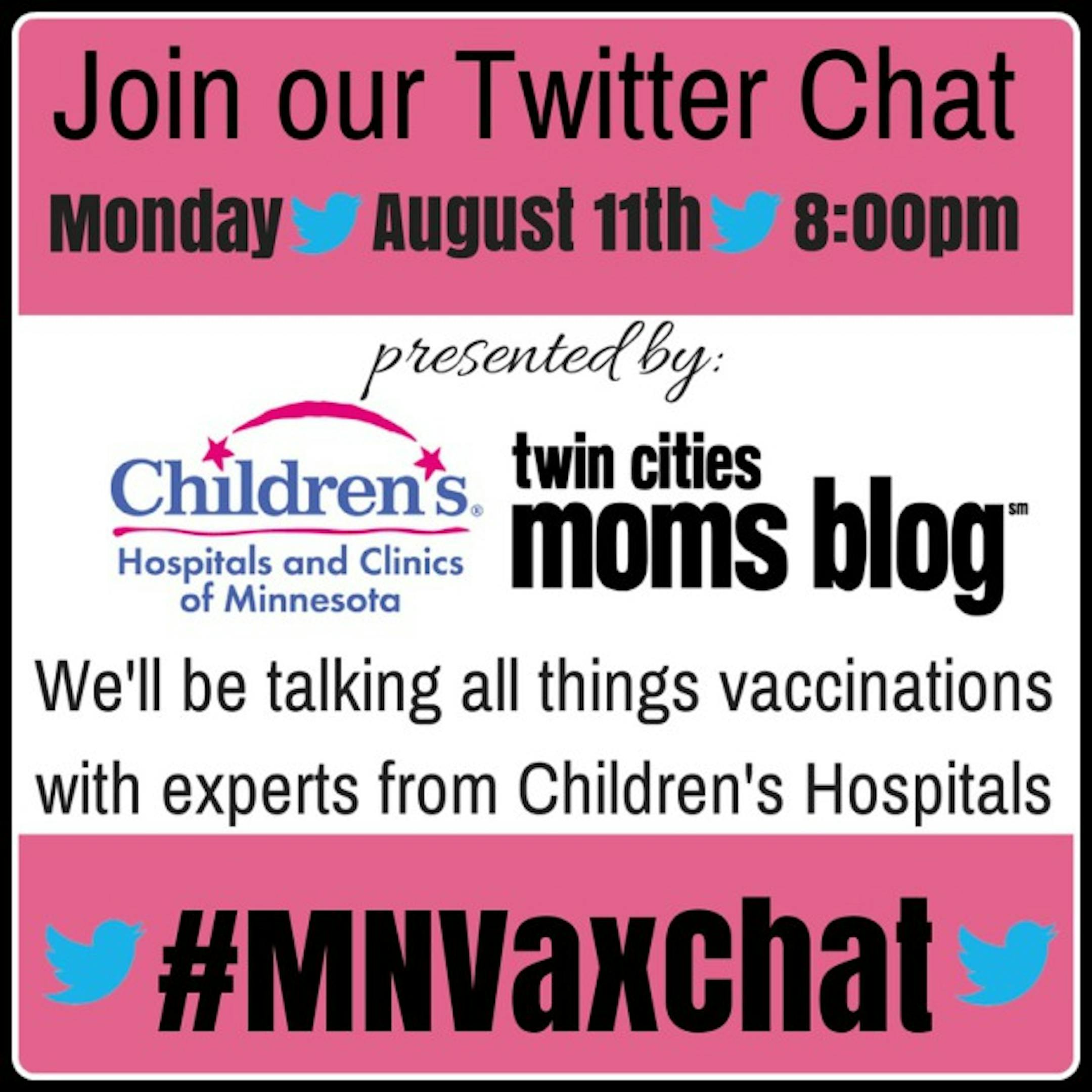 The Twitter chat will take place at 8 pm CST for one hour and you can follow along and participate by using #MNVaxChat In the spirit of full disclosure, I do vaccinate my kids and really feel strongly about it. When one of my children had food allergies a few years back we really took a step back and slowed down the schedule of immunizations but in my mind and heart, I would much rather protect my child from illness for an inconvenient poke than risk illness or disease later on in life.