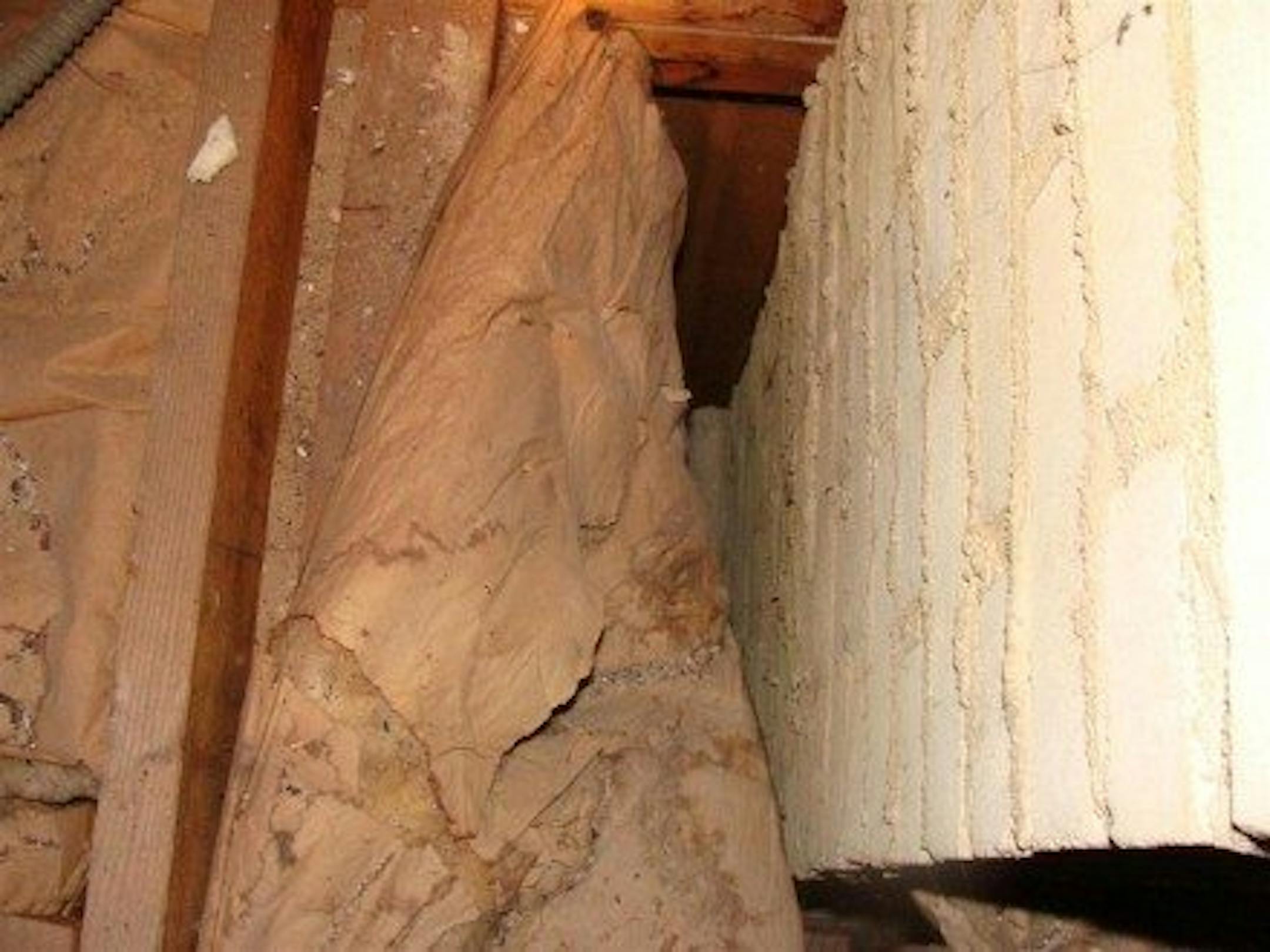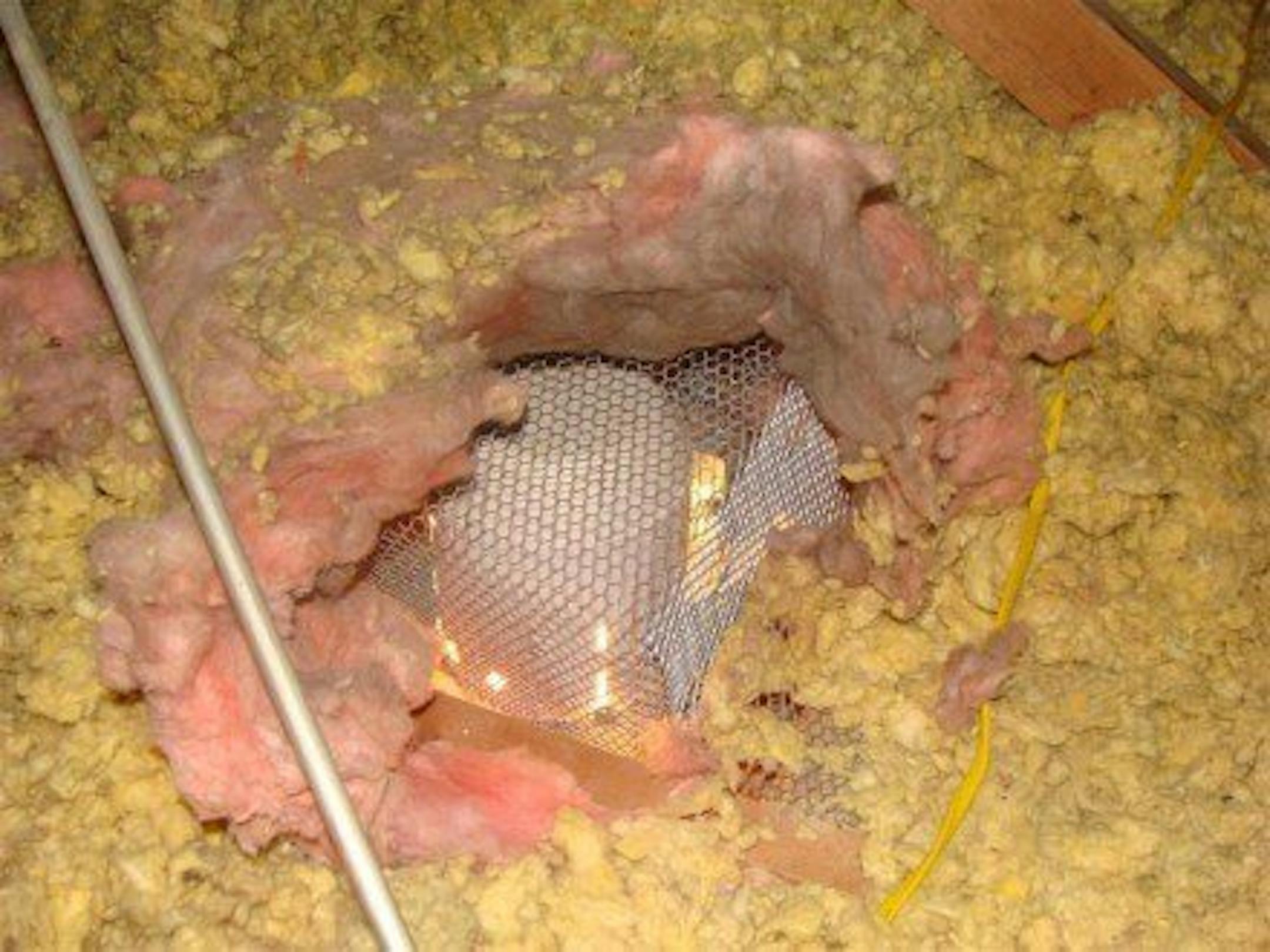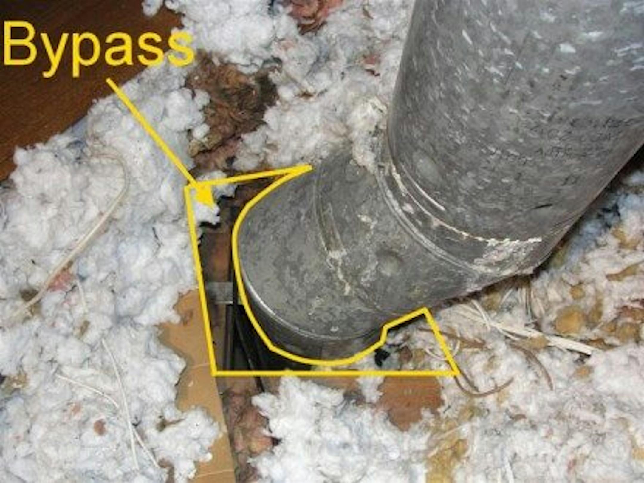 I've accumulated about a bazilli0n photos of attic bypasses over the years, so included below are a few of the most common places you'll find attic bypasses in just about every Minnesota house built before 1991. In all of the photos below, I've pulled the insulation away to reveal the bypasses; you won't find any of these in your attic without moving insulation around. For the record, home inspection standards of practice don't require the home inspector to move insulation... so don't be surprised if your home inspector didn't mention any of this stuff.