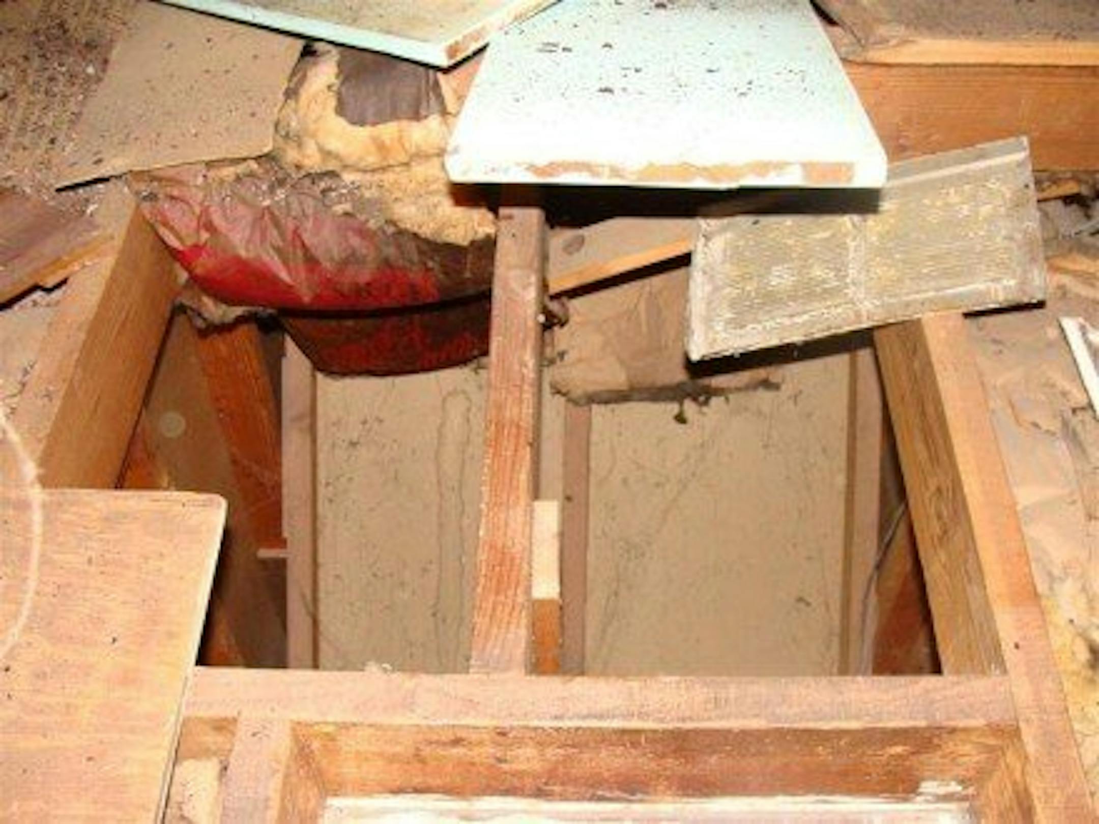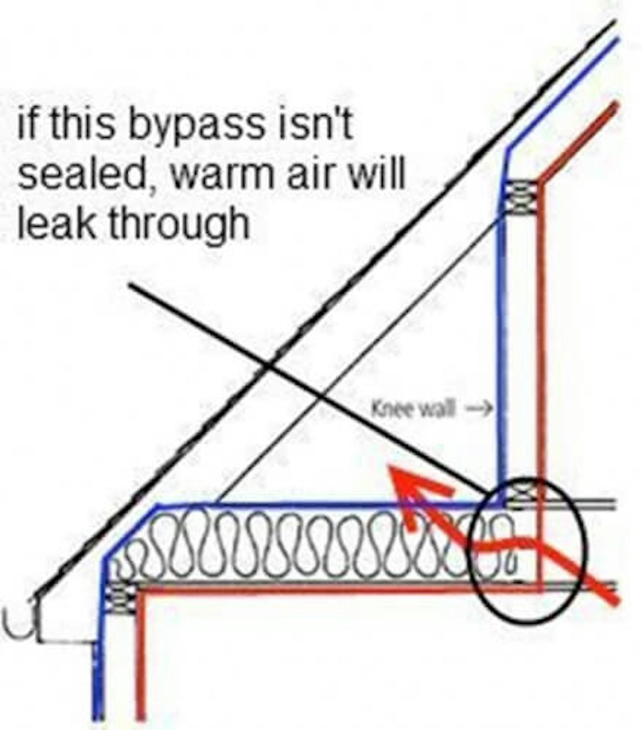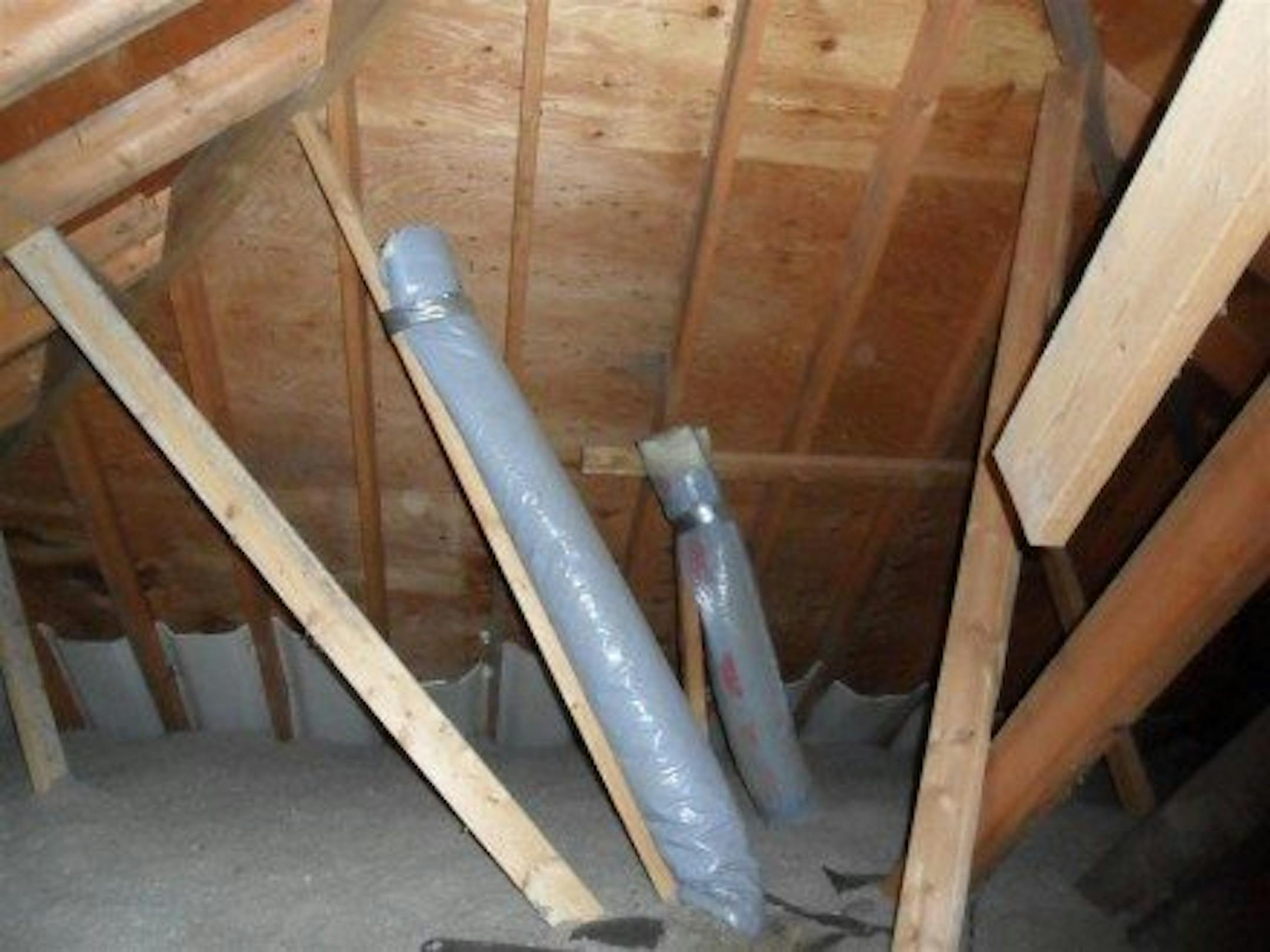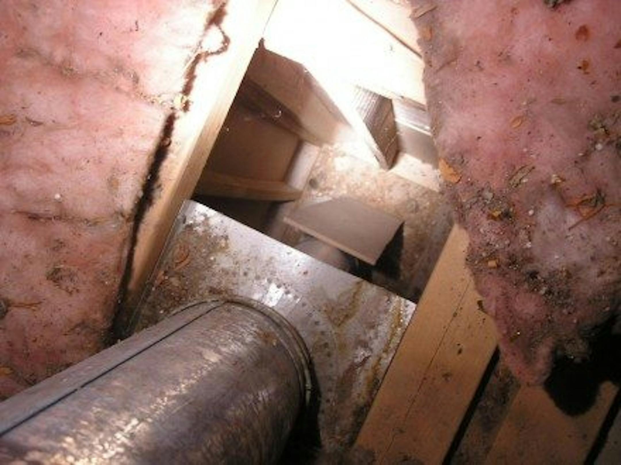 I've accumulated about a bazilli0n photos of attic bypasses over the years, so included below are a few of the most common places you'll find attic bypasses in just about every Minnesota house built before 1991. In all of the photos below, I've pulled the insulation away to reveal the bypasses; you won't find any of these in your attic without moving insulation around. For the record, home inspection standards of practice don't require the home inspector to move insulation... so don't be surprised if your home inspector didn't mention any of this stuff.
