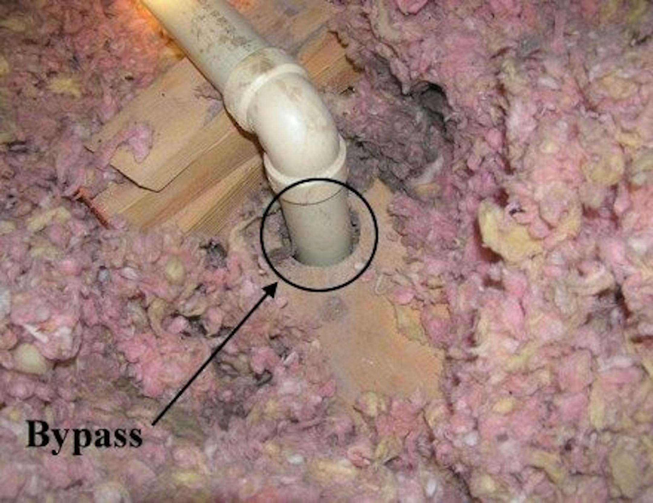 Larger penetrations in to the attic, such as plumbing vents, also need to be sealed. Again, foam in a can works well.