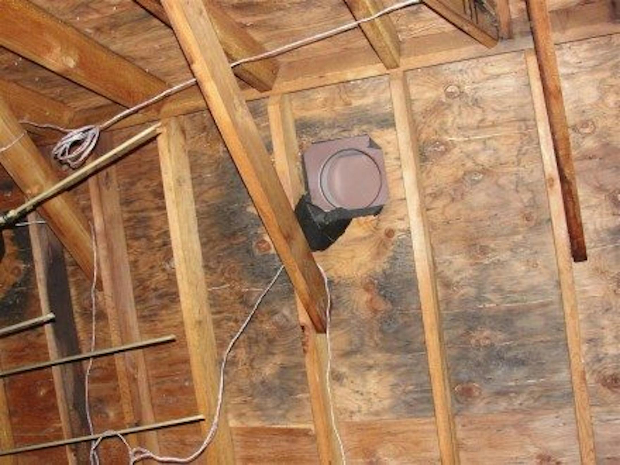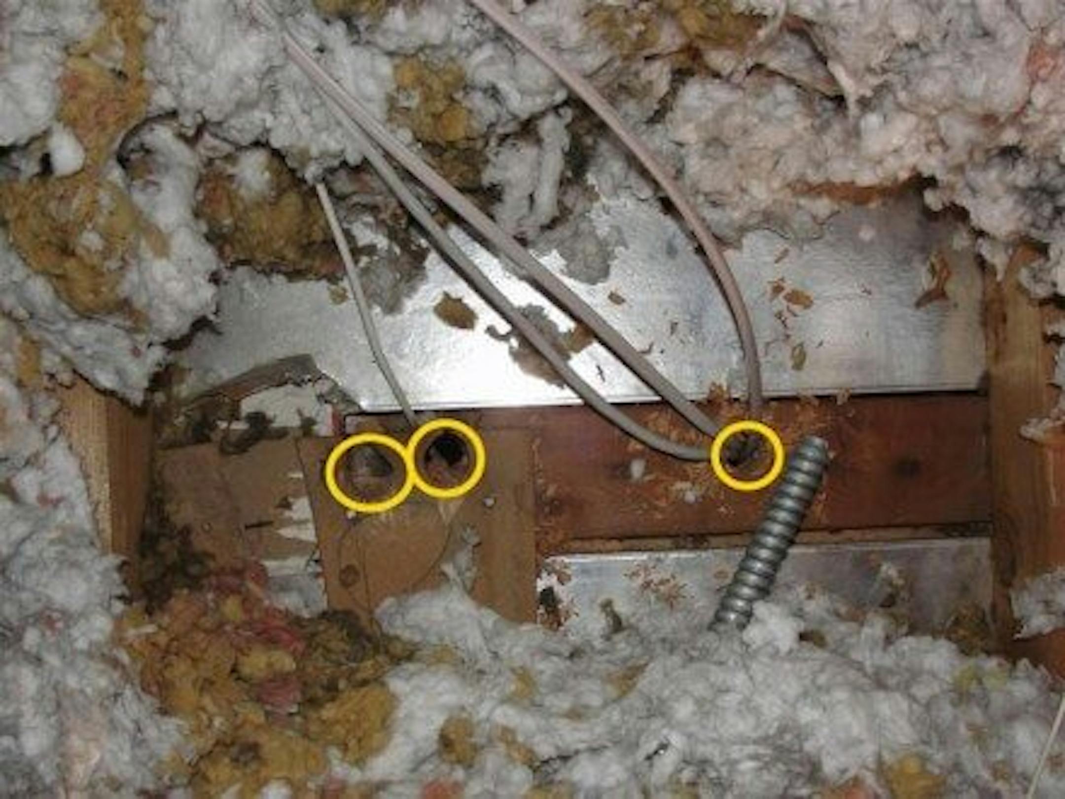 Any time small cables or wires pass through the top plates of walls in to the attic, the holes for the wires should be sealed up. When they're not sealed, they leak air. Do you see how some of the insulation in the photo below has been darkened? It's not mold. This is the result of years and years of air leaking through the insulation; the insulation acts like a filter, and traps all the dust in the air, turning it black. Even though these tiny holes don't seem like a big deal, having them all over your attic can have a huge effect. Sealing these gaps can be easily accomplished with a can of foam insulation.