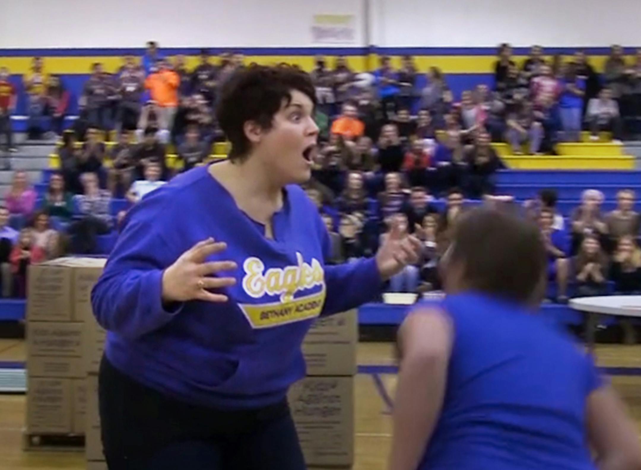 On their final try, Ramey scooped the basketball and crouched down for the granny-style shot. The ball arced upward and came down — short of the basket. As Ramey was turning away, the ball then took a single bounce and snapped through the net. The crowd at Bethany Academy went nuts. Ramey and her daughter screamed with joy.