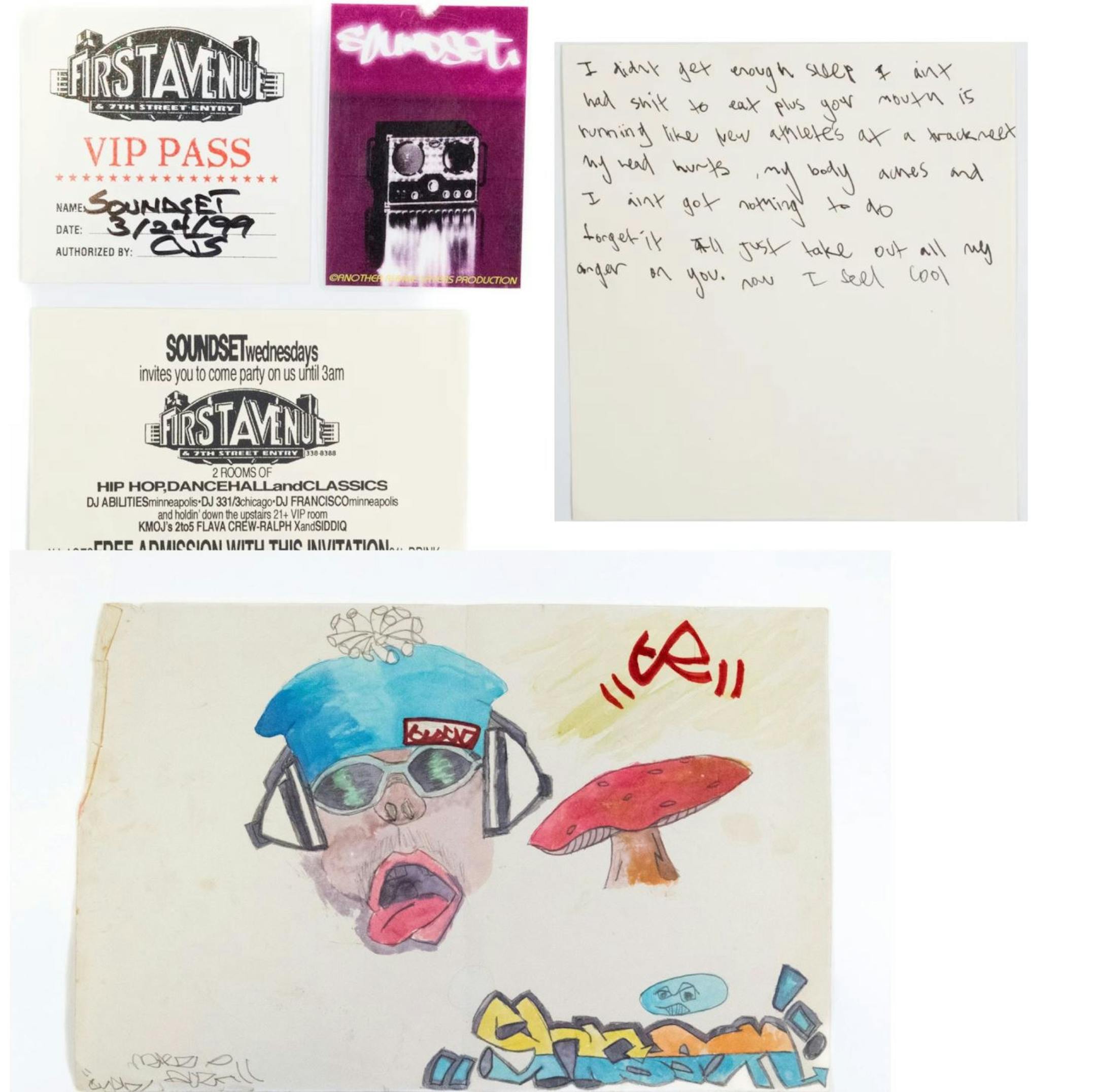 All of the items came out of the house they shared off W. 7th Street in St. Paul. Larsen housed a small recording studio in the basement there, and his turntable partner DJ Abilities (Max Keltgen) also lived there for a while in their youth.
