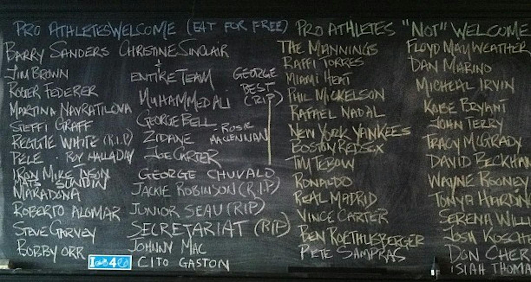 That chalkboard is from The Meat Department, an excellent meat shop in the Danforth neighborhood of Toronto. In addition to serving delicious meats and offering you a half-pint of beer while you wait for your peameal bacon, as happened to us over the weekend, they have a rather amusing list of athletes who "eat for free" at the shop and those who are "not welcome." The not welcome list, by the way, is two more columns wide. We just couldn't fit it all into a picture. Rest assured that Gary Bettman is on the list.