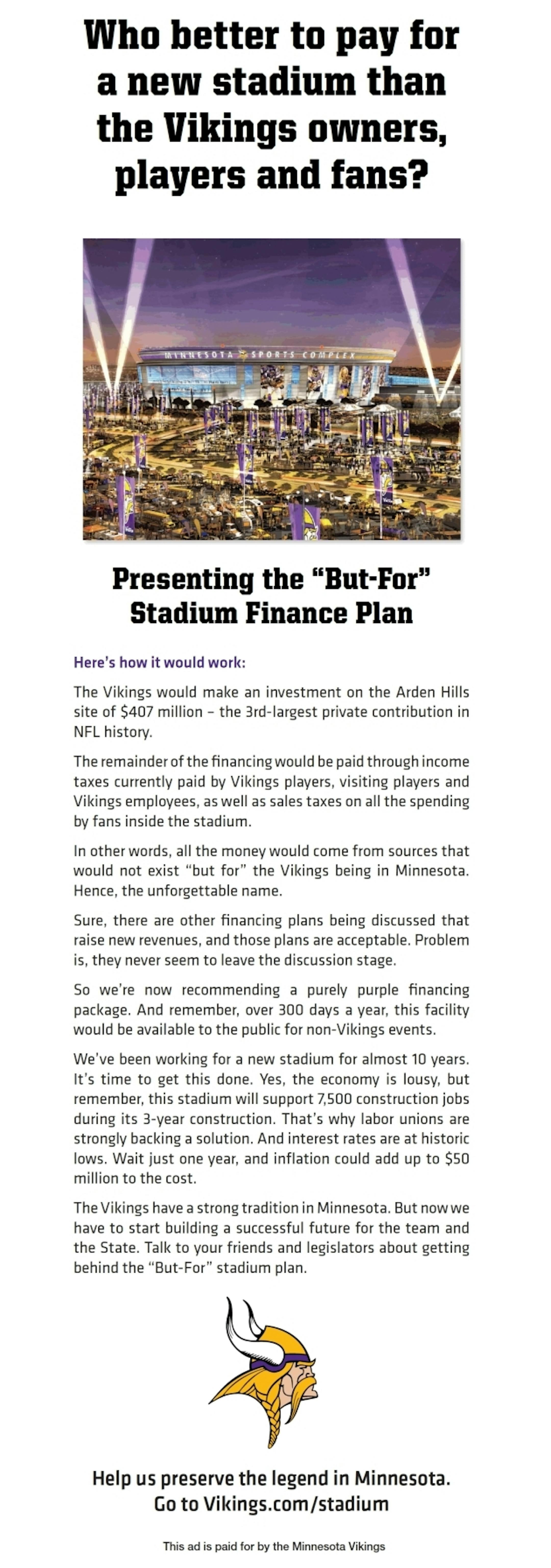 If you picked up the newspaper on Sunday, you may have noticed an advertisement from the Vikings giving a "purple solution" to help pay for the $1.1 billion stadium in Arden Hills, Heron Marquez Estrada reports. The ad can be seen at the bottom of this post. The Vikings propose dedicating the tax revenue derived from the team, players, other employees and fan purchases to pay for the public debt incurred to pay for a stadium for the football team. "In other words, all the money would come from sources that would not exist 'but for' the Vikings being in Minnesota," the ad says.